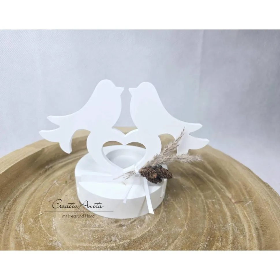 Selbstgemachter Teelichthalter mit einem Vogelpaar und Herz, wunderschön dekoriert mit Trockenblumen.