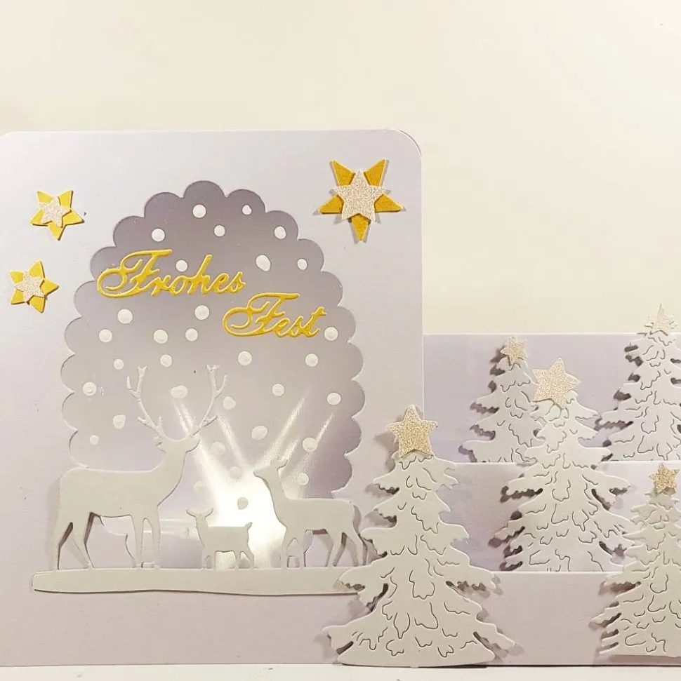 Die besondere Aufstellkarte zeigt eine anmutige Hirschfamilie im verschneiten Winterwald und verleiht deinen Weihnachtsgrüßen eine besonders elegante Note.
