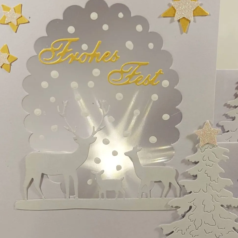 Material: Hochwertige Klappkarte aus Papier, exklusive Ausstanzungen, transparente Sternen-Folie.