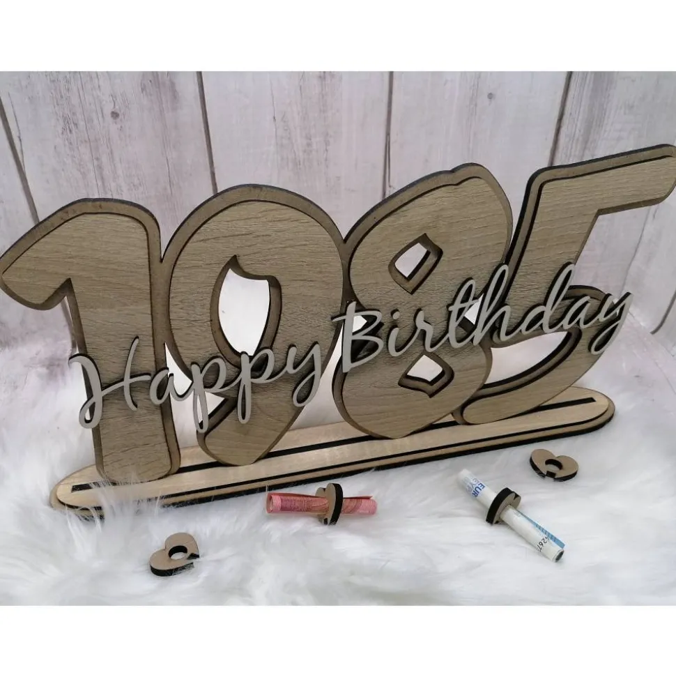 Lieferumfang: eine Jahreszahl, ein Sockel und 4 Herzen (geliefert wird ohne Geld 😉 )