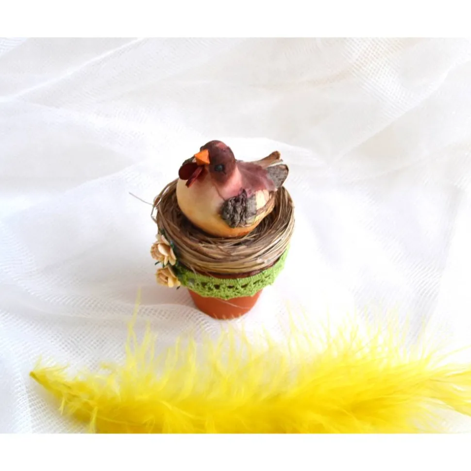 Eine niedliche Osterdekoration, die überall einen Platz findet. Sie passt auf den Ostertisch genauso gut wie auf die Fensterbank. Oder Sie verschenken den kleinen Topf an eine liebe Freundin. Der Topf ist mit einer Spitzenborde und kleinen Papierblumen dekoriert. Die Feder gehört nicht zum Lieferumfang.