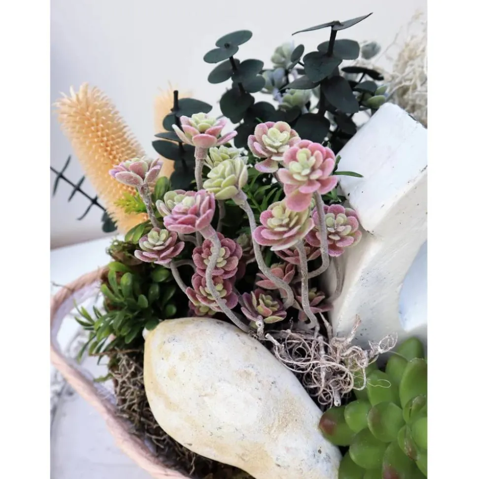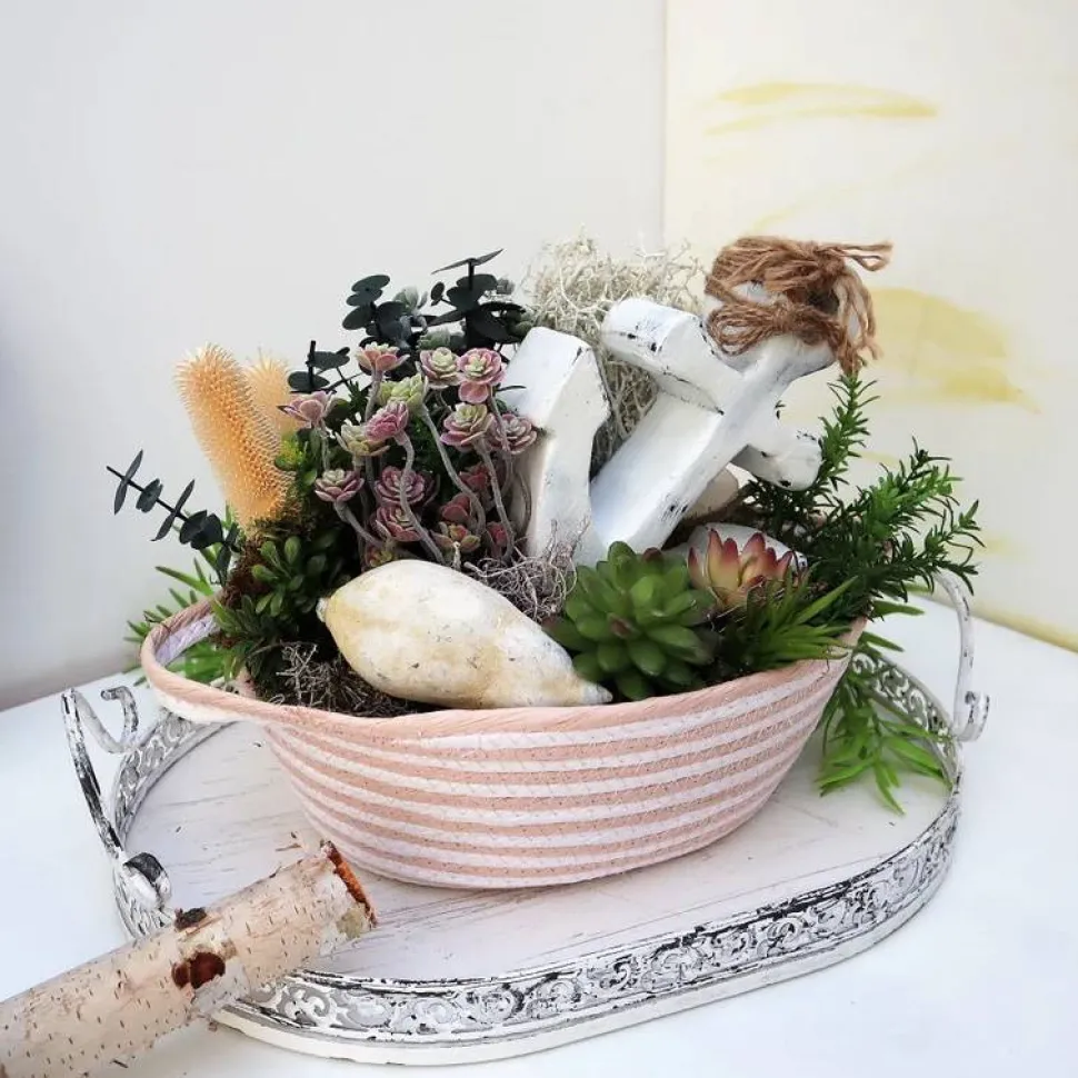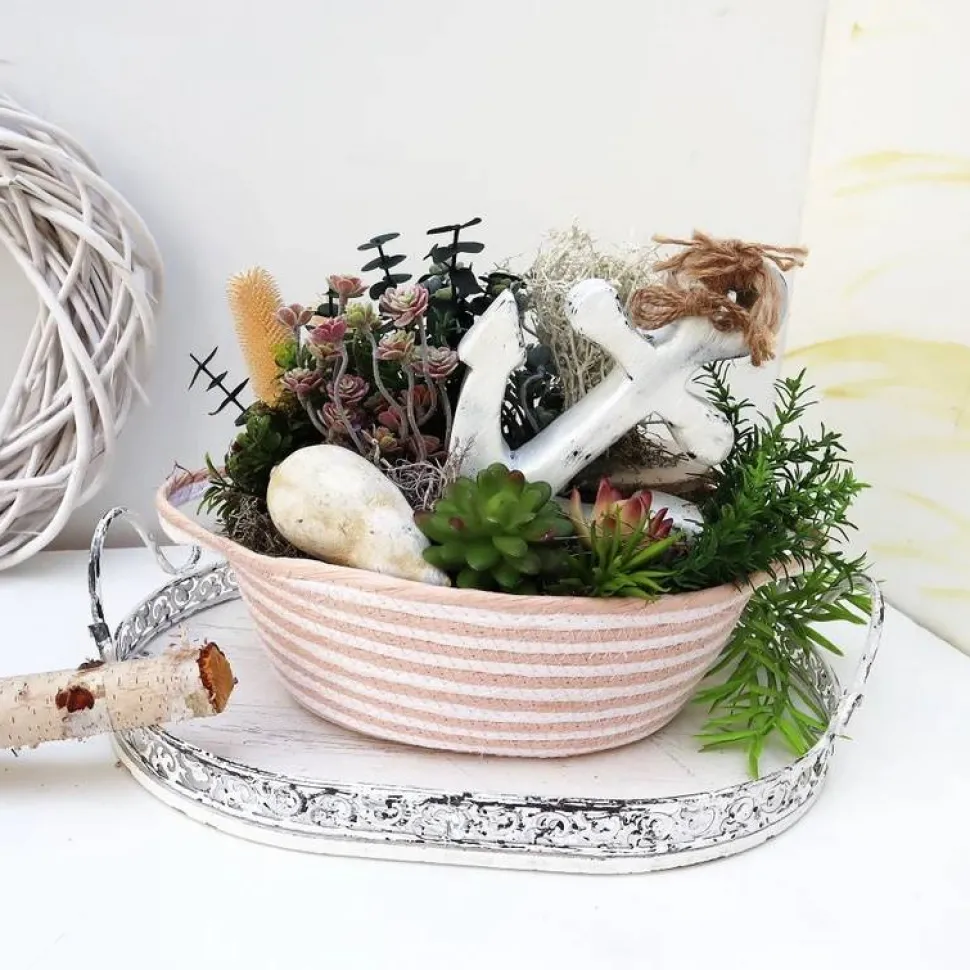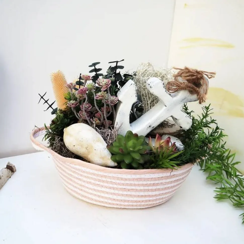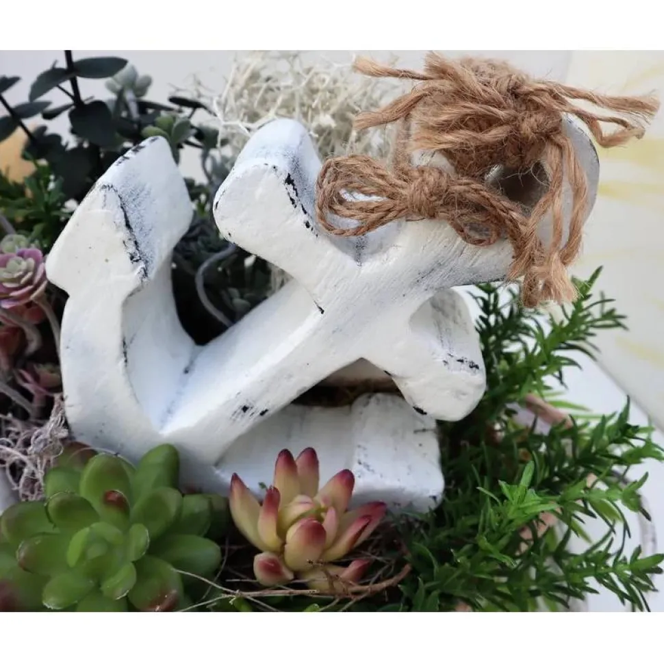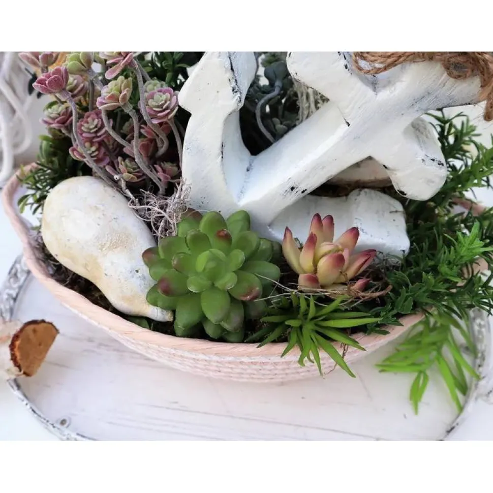 Material: Textilkorb, künstliche Blüten und Grün, Naturmaterialien, Holzanker