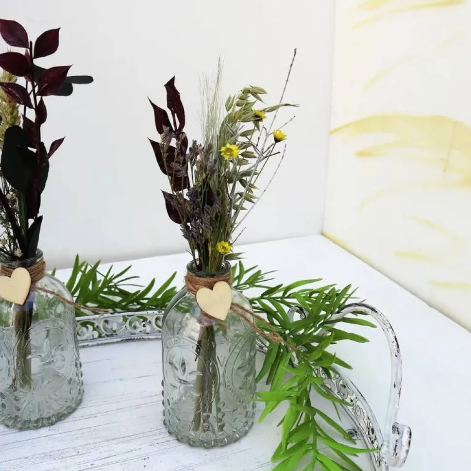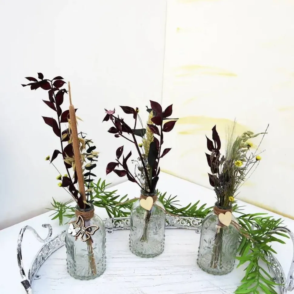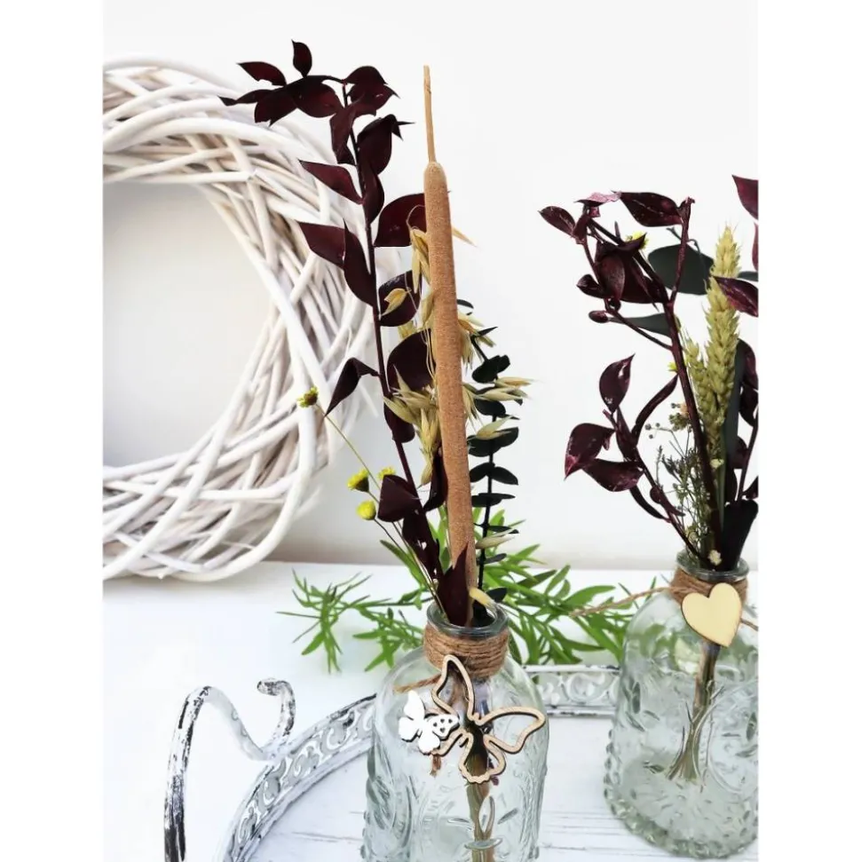 Material: Glasvasen, verschiedene Trockenblumen, Dekoration
