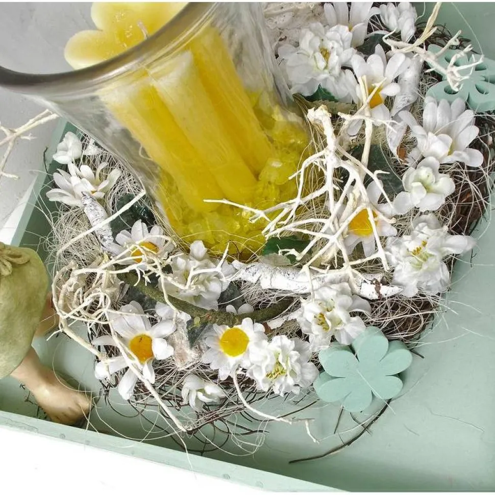 Tischgesteck in grün, mit Windlicht und Kerze, Blumen Elf, Frühlingsdeko,