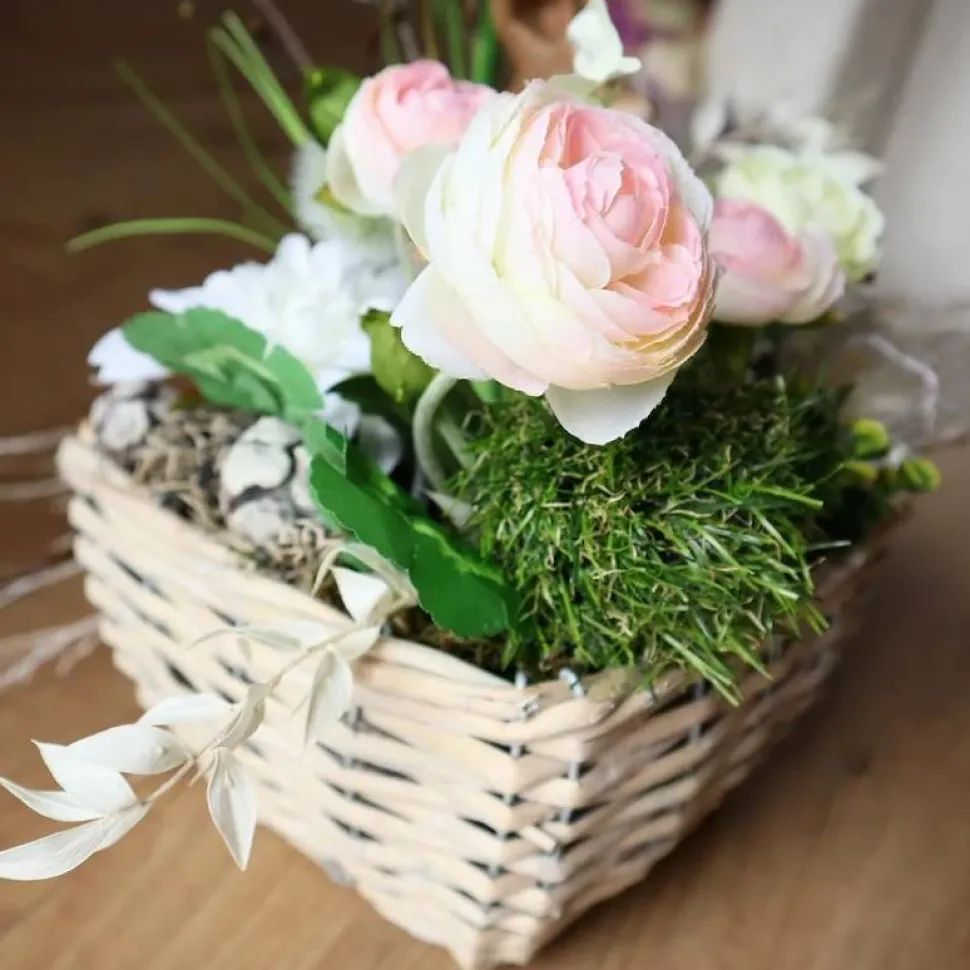 Material: Weidenkorb, künstliche Blüten und Grün, Hasenfigur, Naturmaterialien