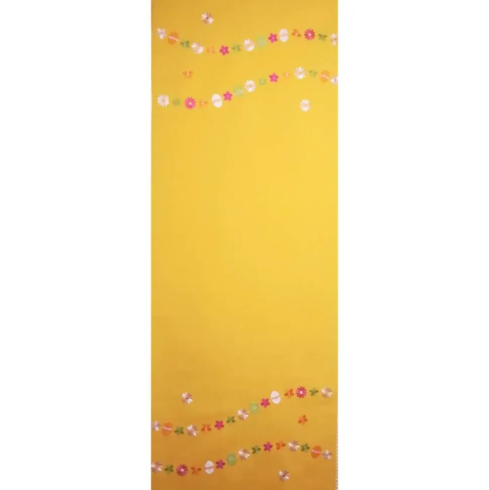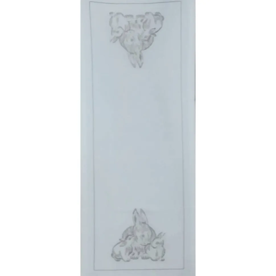 Ein Läufer genäht aus einem Baumwolldruck worauf Hasen dargestellt sind auf Karten oder im Bilderrahmen mit Frühlingsblumen, Schleifen und Küken.