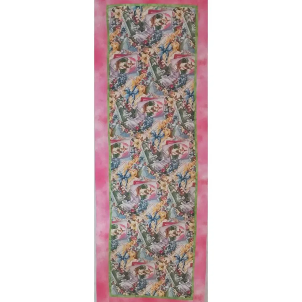 Der Stoff ist pastellfarben in blau und rosatönen. Dieser Läufer hat einen schmalen hellgrünen und breiteren rosefarbenen Rand. Die Rückseite ist abgefüttert.