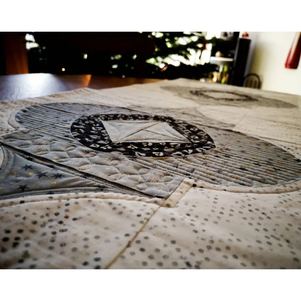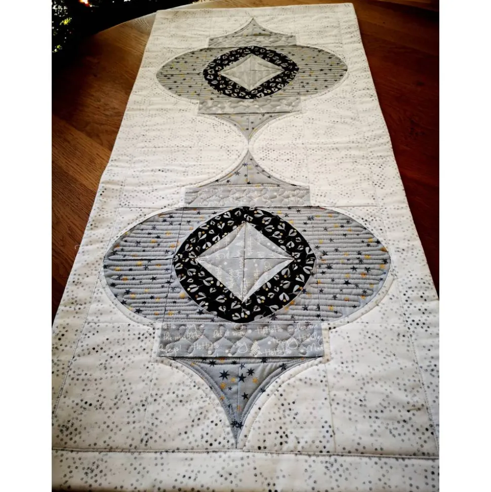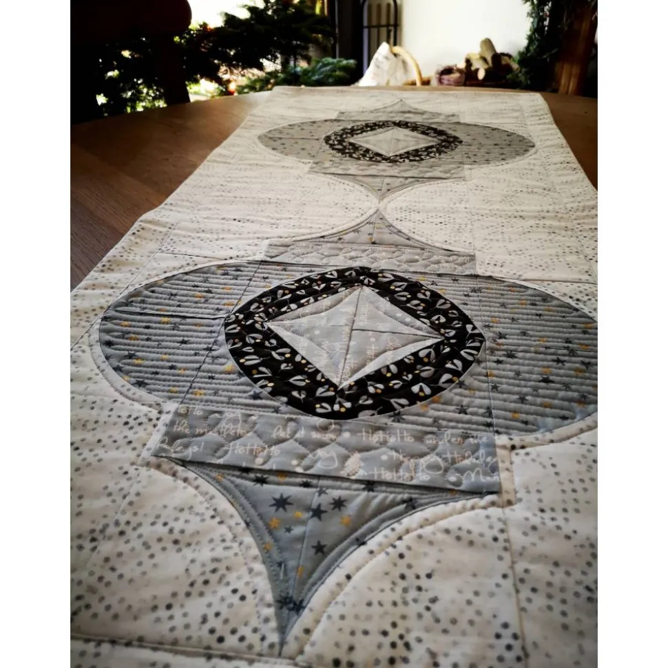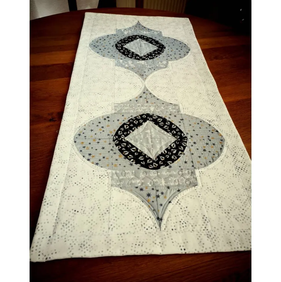 Der Läufer wurde mit der Maschine gequiltet und genäht. Der Hintergrund besteht aus einem weißen Stoff mit zartem, hellgrauem Muster. Die Ornamente sind aus verschiedenen grauen Designerstoffen mit Mustern. Alle Stoffe stammen von Brigitte Heitland (Zen Chic), aus der Serie White Christmas. Ein besonderes Highlight sind die goldenen Akzente im Sterne- und Mistelstoff, die dem Läufer einen edlen Touch verleihen.