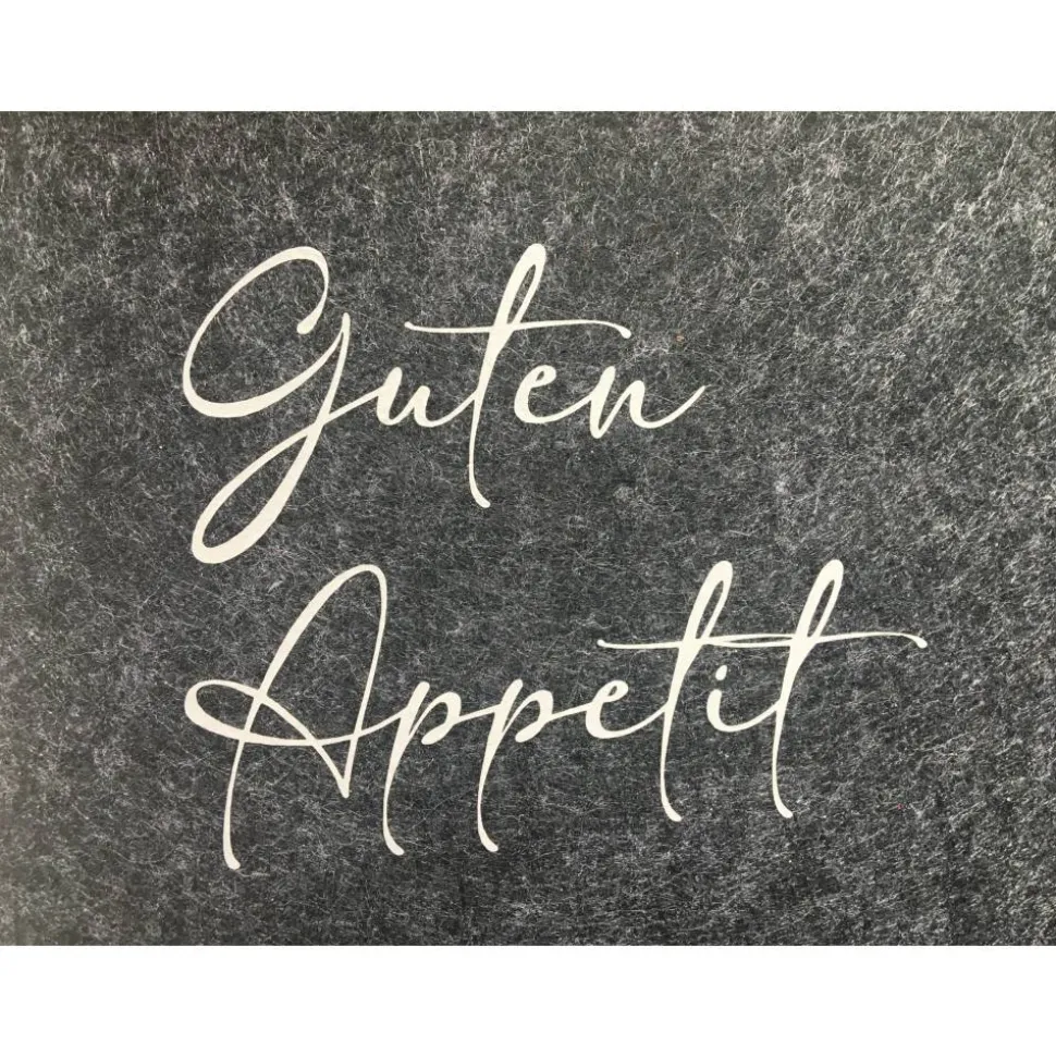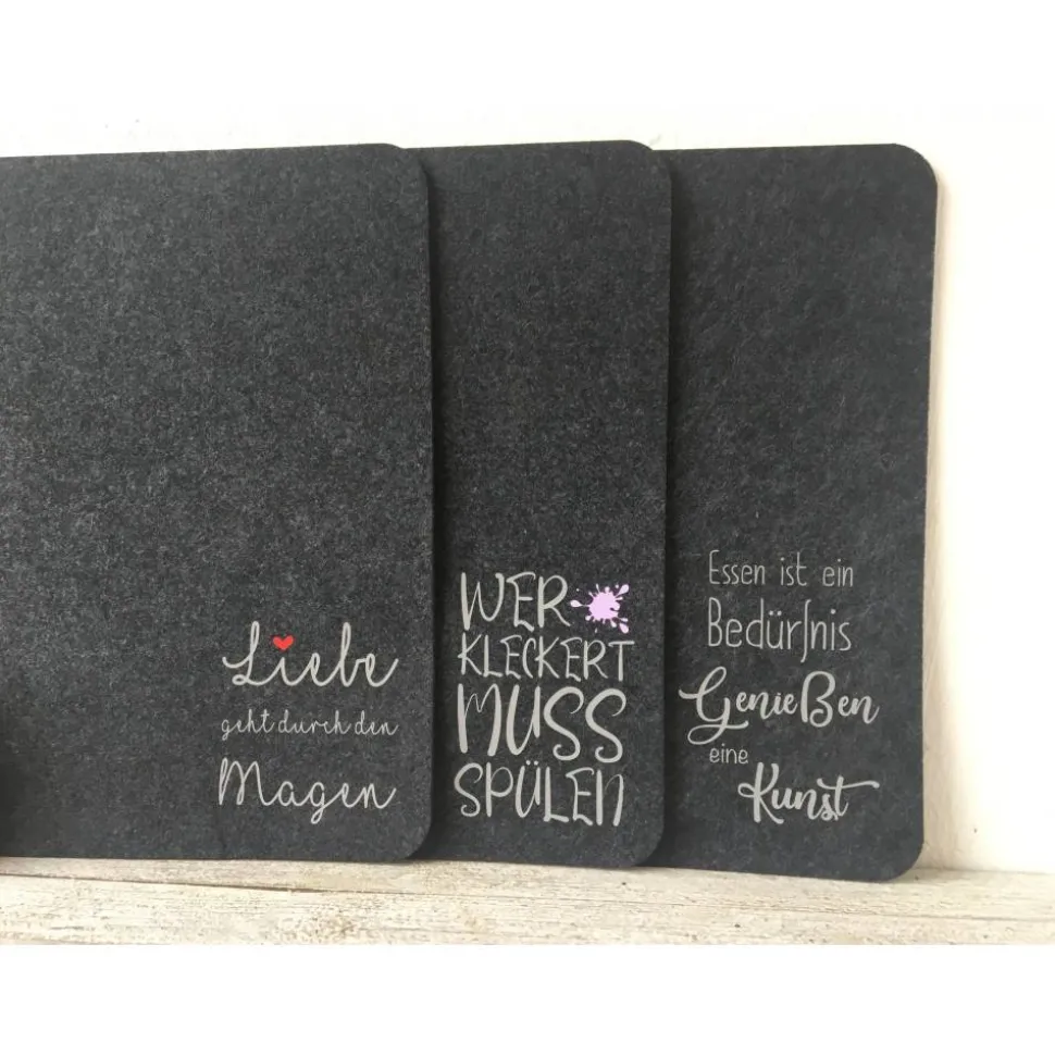 Die hier angebotenen Tischsets sind 44 x 30 cm groß, aus abwaschbarem anthrazitfarbenem Filz und mit verschiedenen Sprüchen bzw. einem Hirsch beplottet: