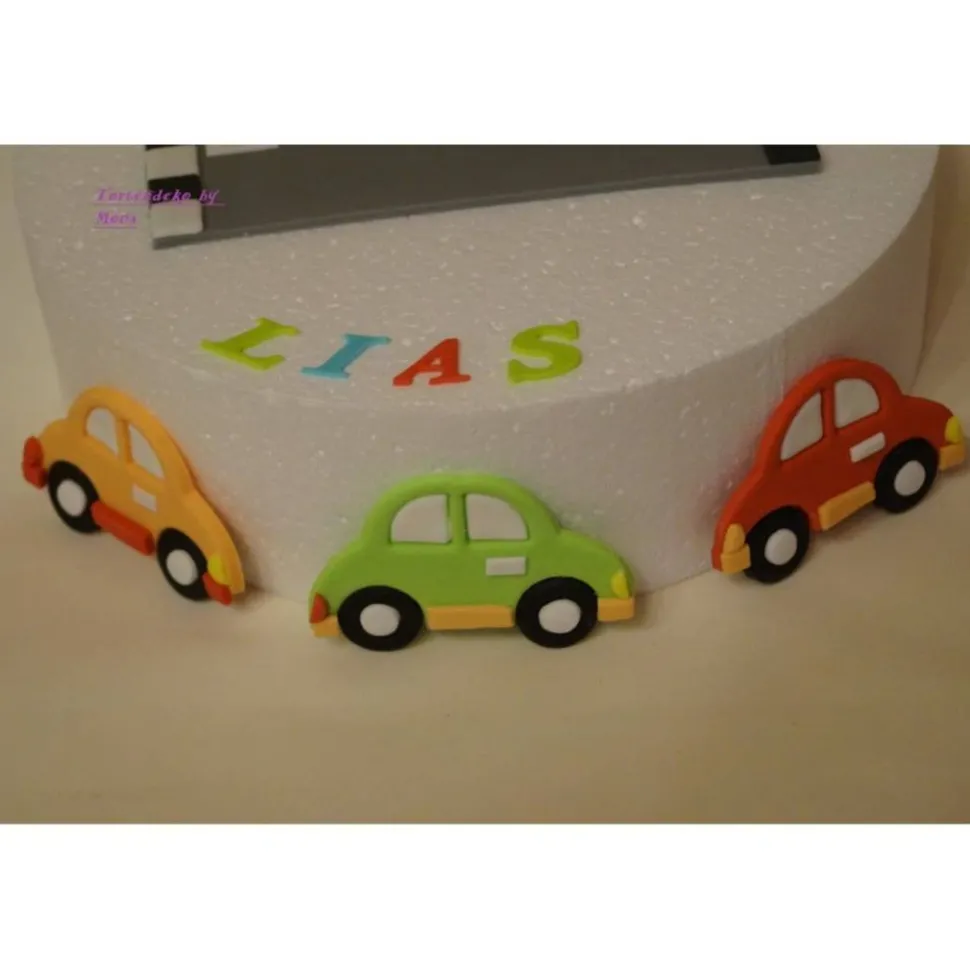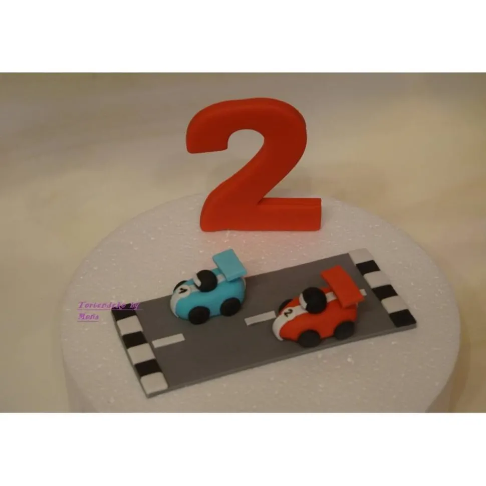 Tortenmotiv Strasse mit 2 Autos entweder 2 Rennautos oder 2 Strassenautos und 3 Autos für den Rand und Zahl und Name .