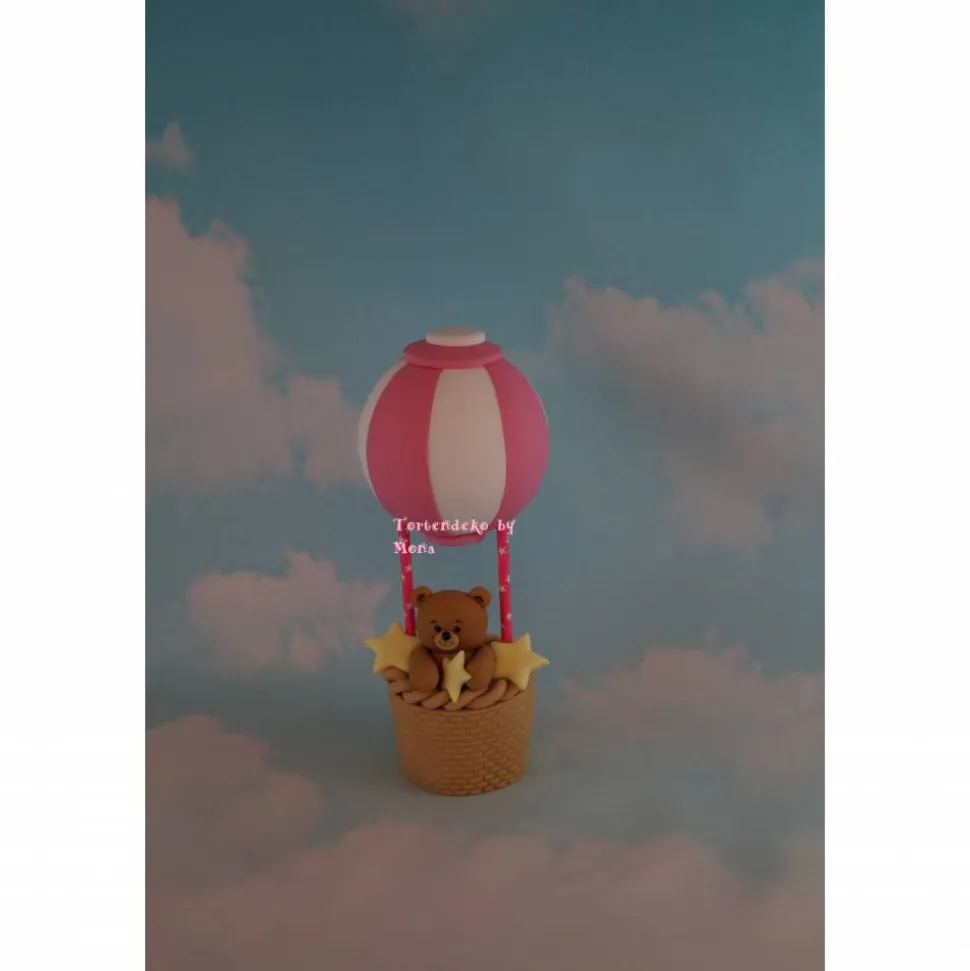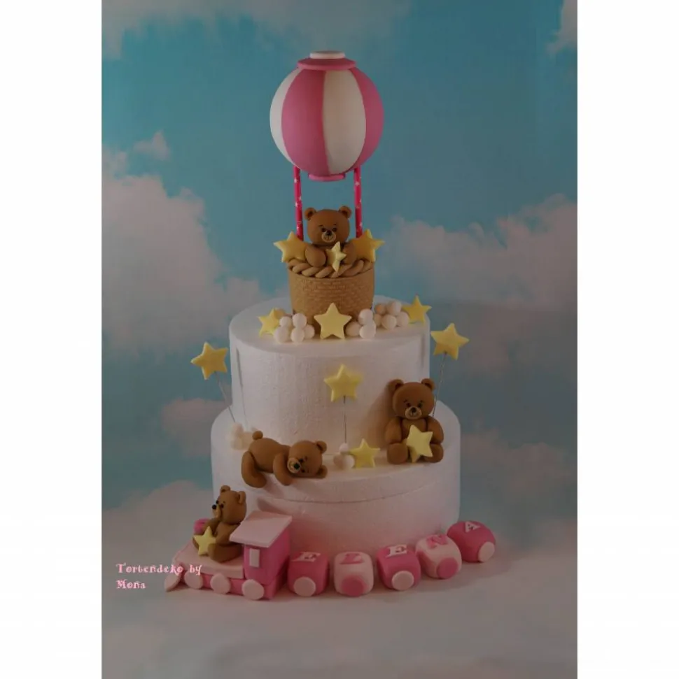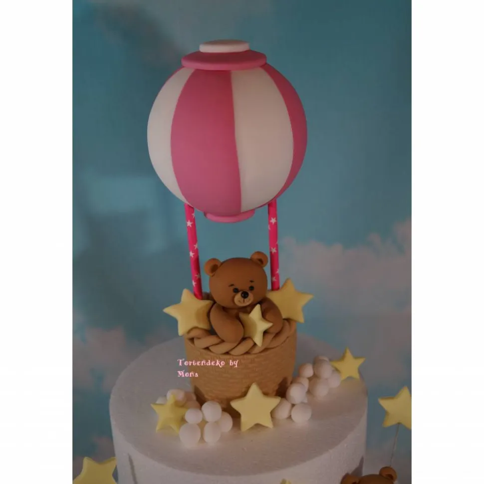 Tortenmotiv Heißluftballon mit Teddys und Zug mit Namen, Sterne und Wolken. Es sind verschiedene Varianten, die Sie gerne kaufen möchten möglich, einfach die Variante wählen. Der Ballon besteht aus einer Styropor Kugel mit einem Durchmesser von 10 cm . Höhe der Ballons von Korb( Styropor drunter) ab sind 25 cm.Teddys sind ca 7 cm hoch.
