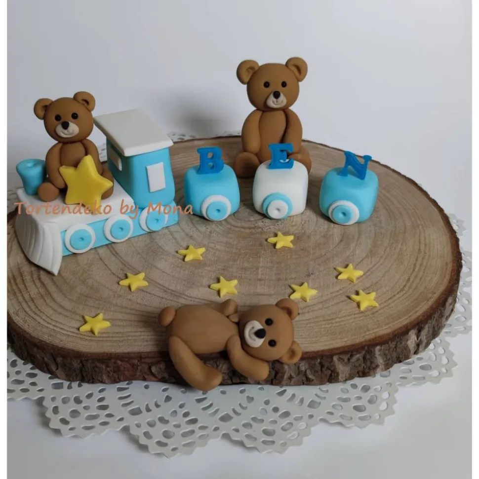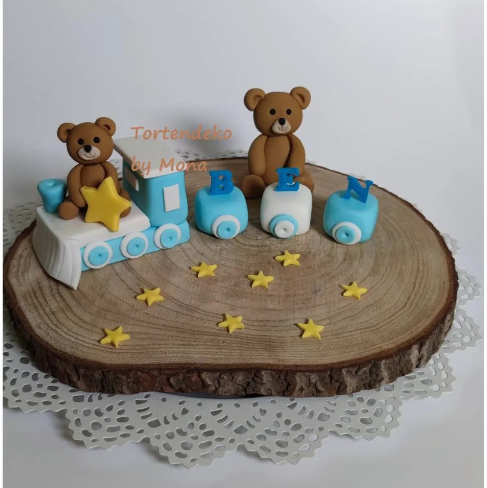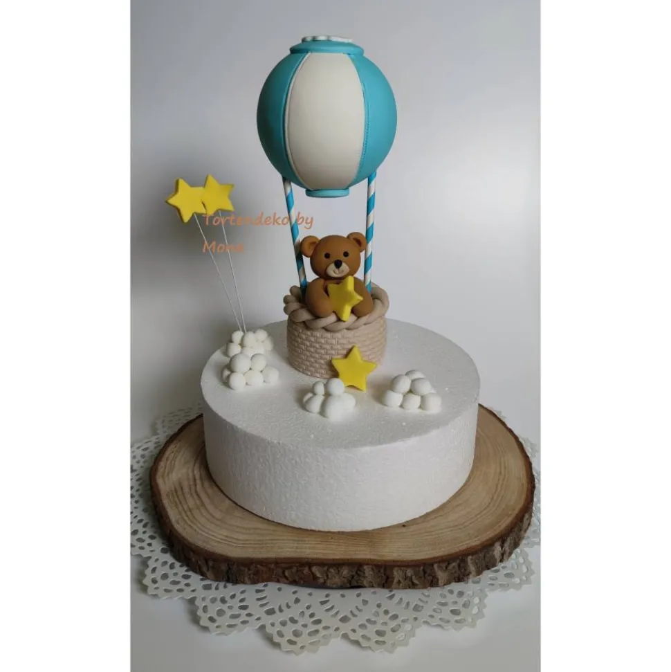 Tortenmotiv Heißluftballon mit Teddys und Zug mit Namen, Sterne und Wolken. Es sind verschiedene Varianten, die Sie gerne kaufen möchten möglich, einfach die Variante wählen. Der Ballon besteht aus einer Styropor Kugel mit einem Durchmesser von 10 cm . Höhe der Ballons von Korb( Styropor drunter) ab sind 25 cm.Teddys sind ca 7 cm hoch.