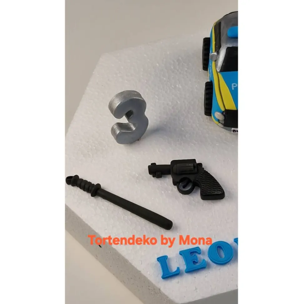 Verwandle jede Torte in ein Highlight mit diesem handgefertigten Tortenaufleger Fondant Polizeiauto mit Zubehör.