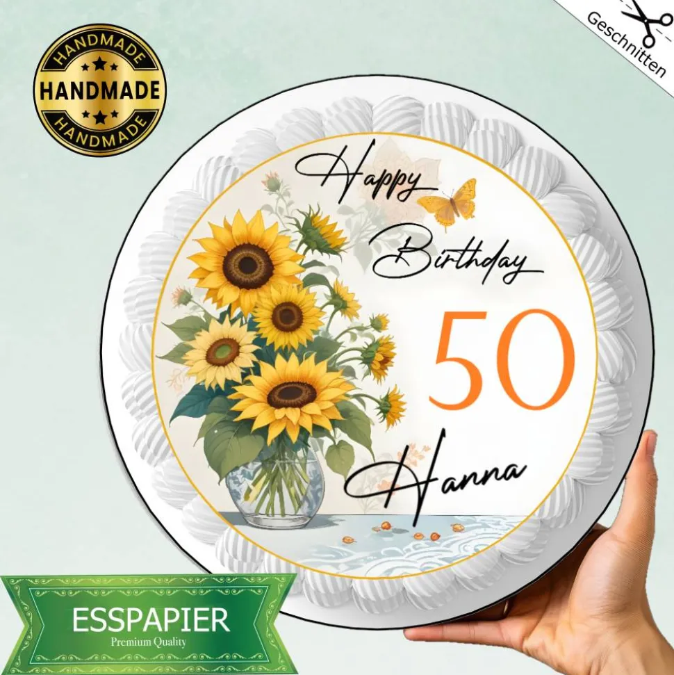 Verleihen Sie Ihrer Geburtstagstorte mit unserem wunderschönen essbaren Tortenaufleger den perfekten letzten Schliff! Die Sonnenblumen und der Schmetterling sorgen für einen festlichen Blickfang, während das dezent orange Farbschema Ihrem Anlass eine edle Note verleiht.Das Geburtstagskind wird begeistert sein.
