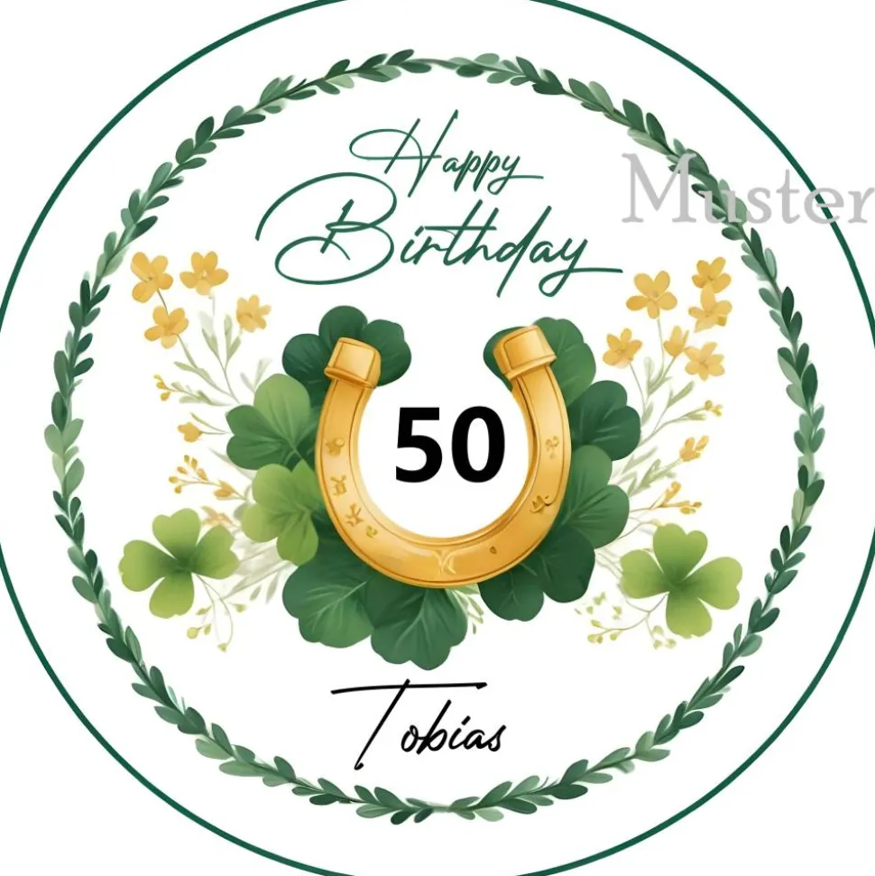 Feiern Sie mit einer Torte und Glückssymbolen! Der Tortenaufleger „Happy Birthday Hufeisen“ verleiht Ihrer Geburtstagstorte eine elegante und dezente Note. Zeigen Sie Ihre Wünsche mit einem Hufeisen und Kleeblatt. Das Geburtstagskind wird sich über die guten Wünsche freuen. Der Aufleger wird mit dem Namen und der Wunschzahl personalisiert .