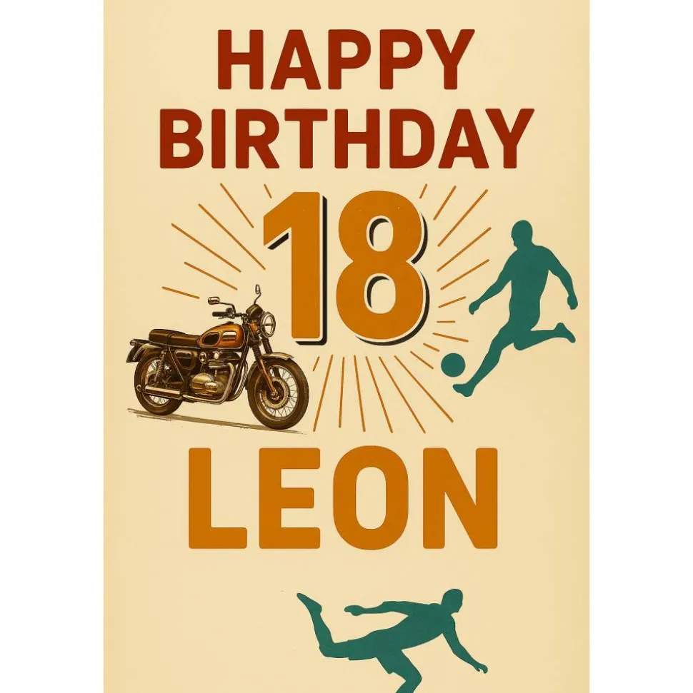 In der Galerie findest du das Beispiel für ein Wunschmotiv. Wir haben für den 18. Geburtstag von Leon ein modernes, maskulines Motiv gestaltet, das seine Hobbys Motorrad und Fußball elegant aufgreift. Aus einem Foto von ihm haben wir zudem ein illustriertes Portrait gestaltet und daraus ein Design kreiert.