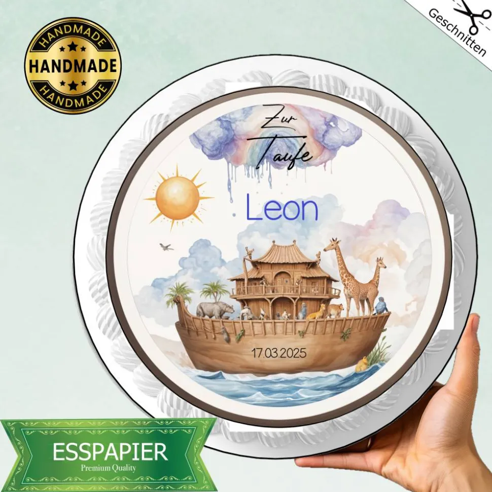 Verleihen Sie Ihrer Tauf-Torte mit unserem edlen Tortenaufleger mit dem Motiv Arche und Tiere einen Hauch von Eleganz!