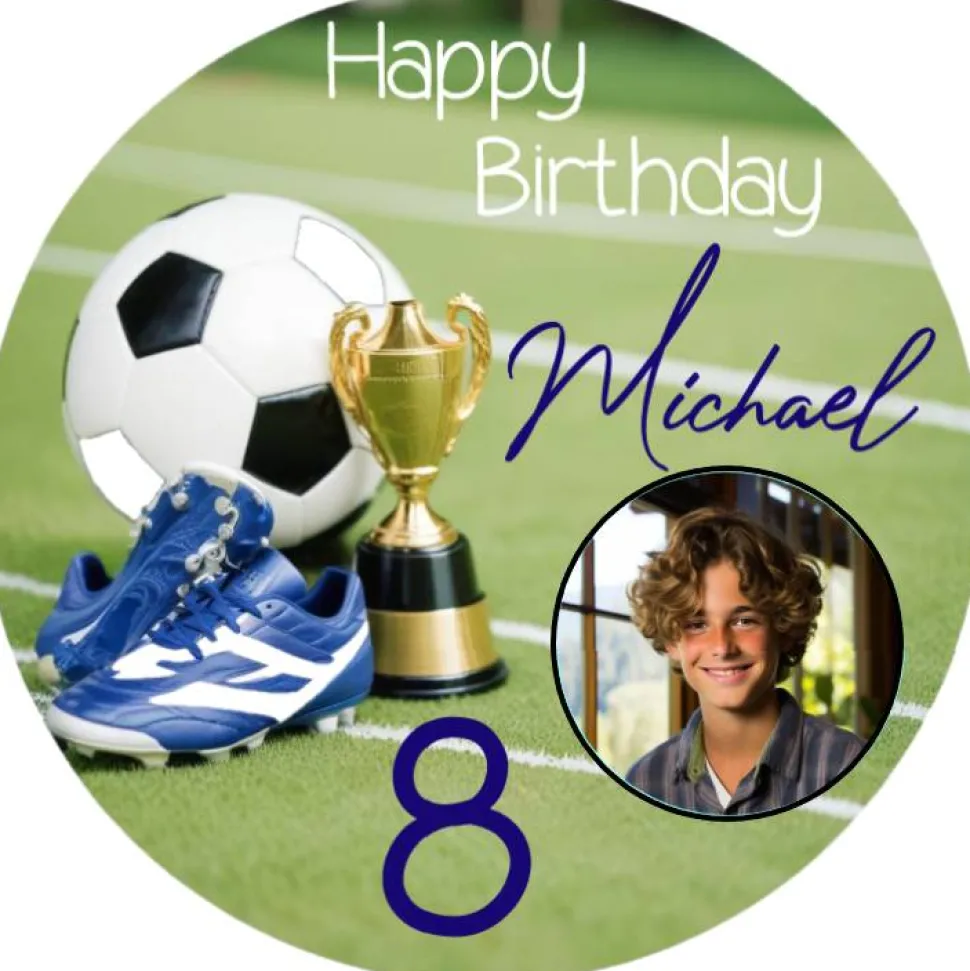 Unser Tortenbild Fußball Happy Birthday ist das Highlight für jeden Fußballgeburtstag! Wir personalisieren es mit dem Namen und der Wunschzahl des Geburtstagskindes. Das Bild wird auf Esspapier gedruckt und ist bereits ausgeschnitten, sodass es nur noch auf die Torte gelegt werden muss. Für eine einfache und beeindruckende Dekoration