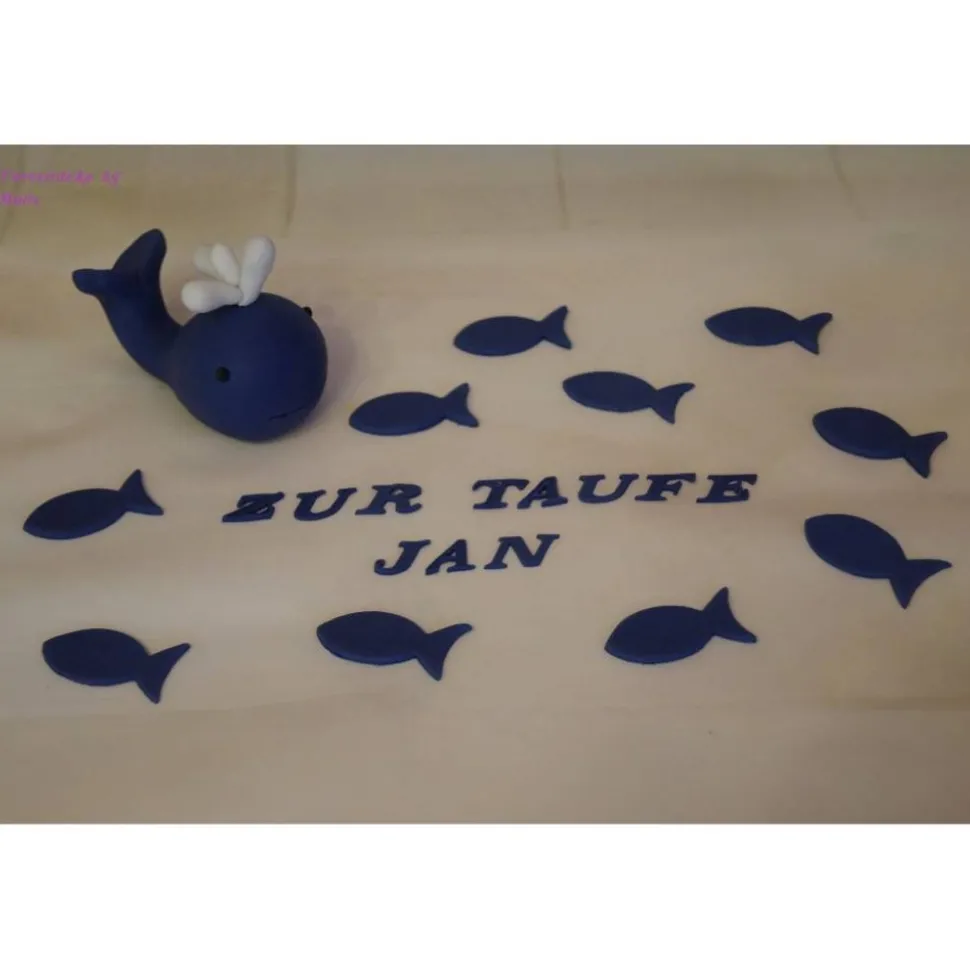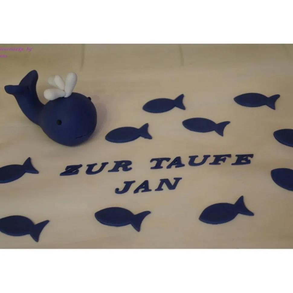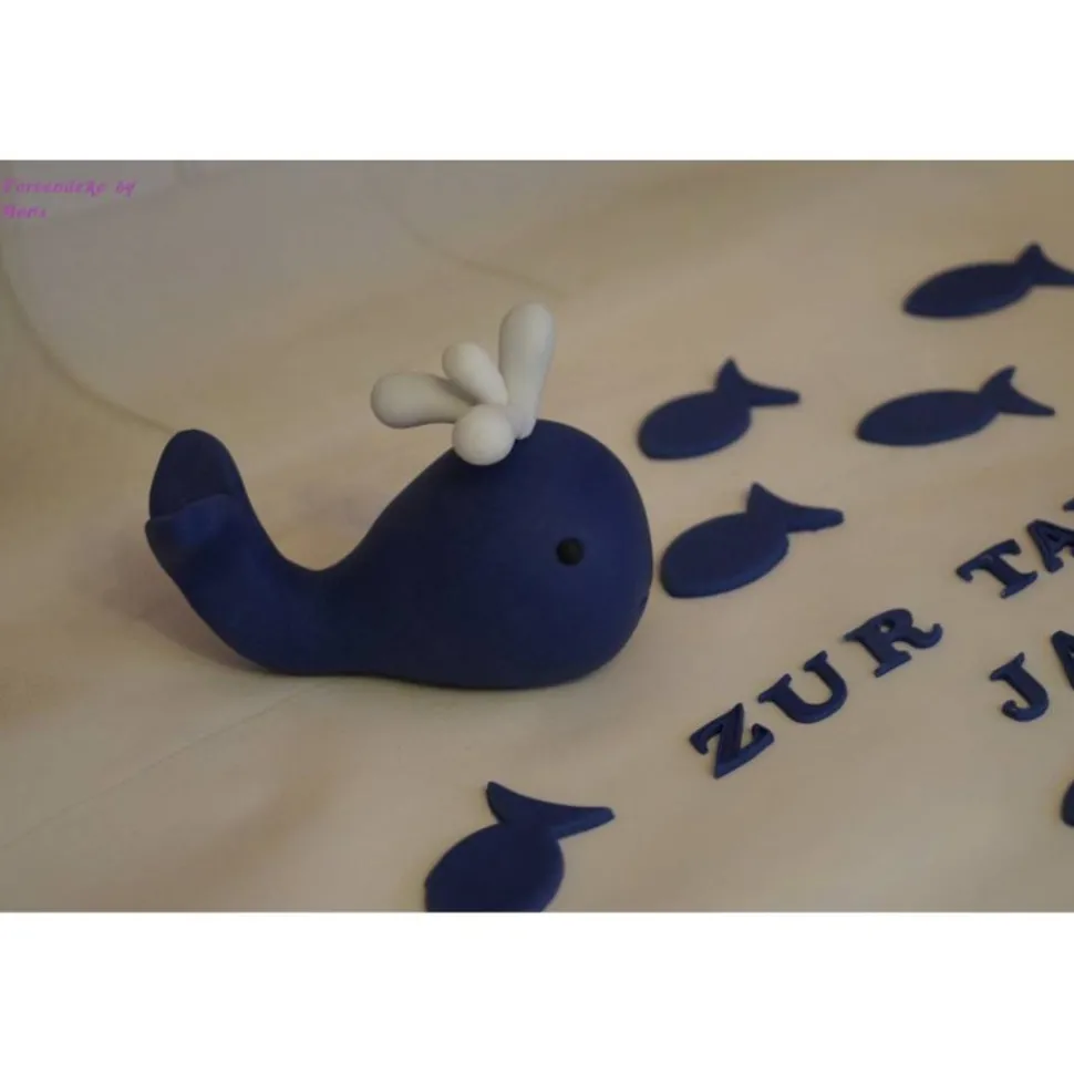 In dieser Auktion bekommt ihr eine Tortendeko für die Taufe, Geburt, Geburtstag. Hier ist ein Wal mit Fischen und Schriftzug.
