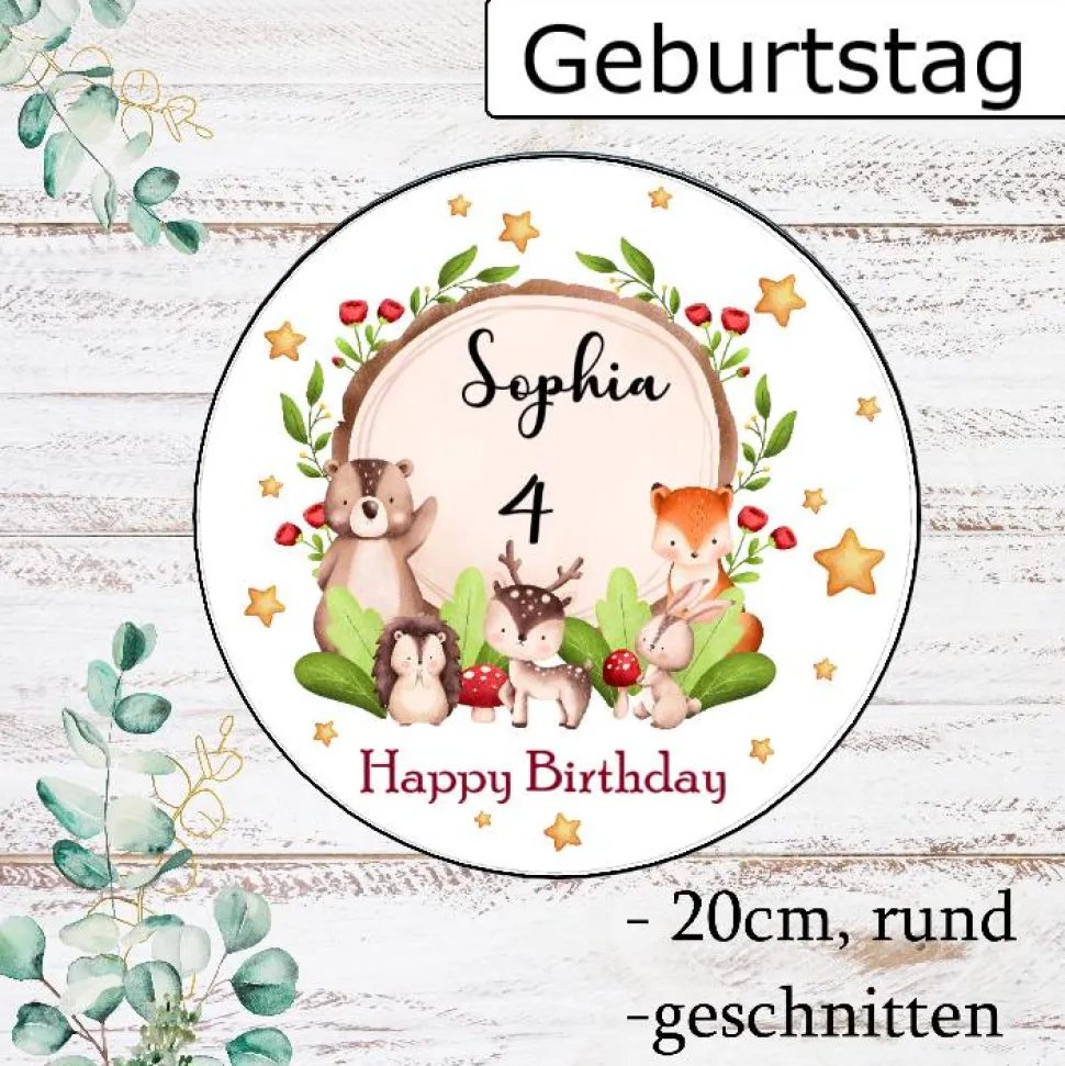 Mit süßen Waldtieren, Sternen, deinem Namen und der Geburtstagszahl