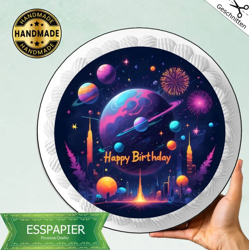 Erlebe eine galaktische Geburtstagsfeier mit unserem Tortenaufleger Weltraum Happy Birthday! Die knalligen Farben und das moderne Design werden das Geburtstagskind überwältigen. Bunte Planeten, explodierende Sterne — wie ein knalliges Feuerwerk. Langweilige Torten gehören der Vergangenheit an, denn dieser Aufleger mit bunten Planeten und Happy Birthday bleibt garantiert in Erinnerung.