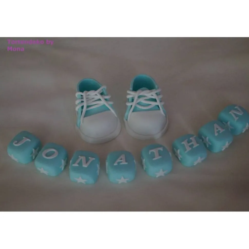 Eine Tortendeko für die Geburt, Geburtstag, Taufe ein Taufset mit Schuhe, Name in Würfelform, alles was im Angebot zu sehen ist gehört zum Angebot
