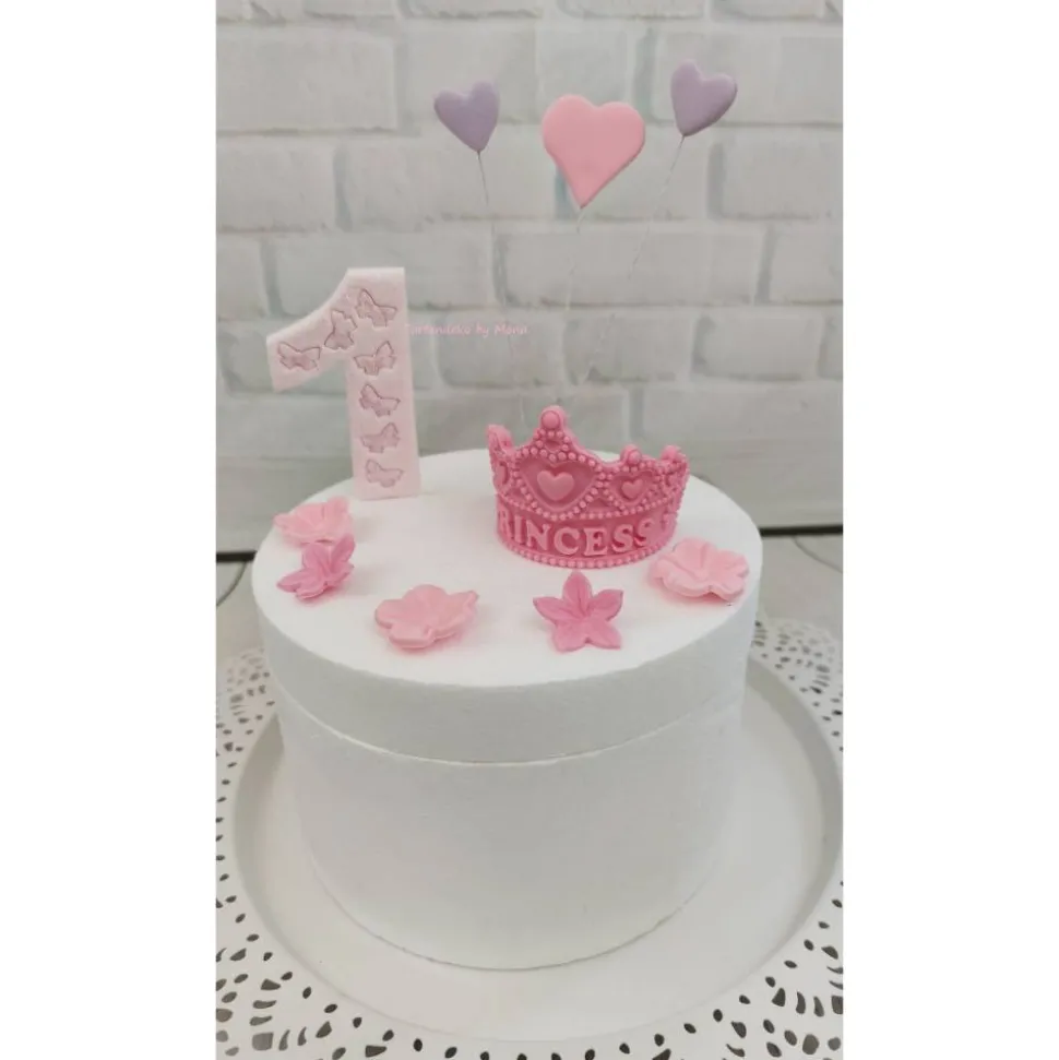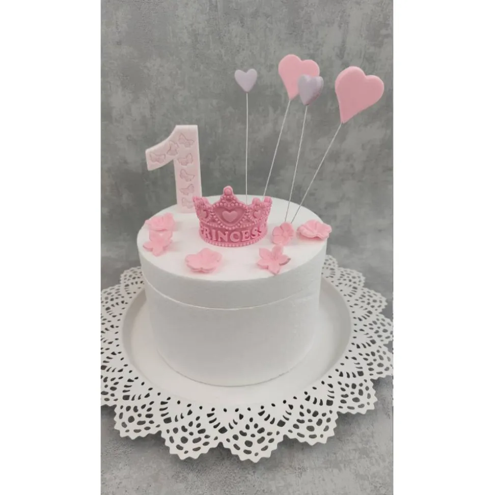 Hier bekommt ihr ein tolles Set für eine Prinzessin Torte zum 1. Geburtstag. Im Set enthalten sind eine Zahl nach Wunsch, eine Krone, 2 große und 2 kleine Herzen und 6 Blumen. Der Name kann auf Wunsch dazu erworben werden.