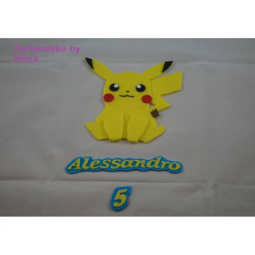 Eine Tortendeko für den Geburtstag von Pokemon . Komplett enthält Pika 2 x verschieden, Bisasam, Glumanda, Pokeball, Pokeschrift, Namenszug und Zahl. Die Figuren sind 15 cm groß.