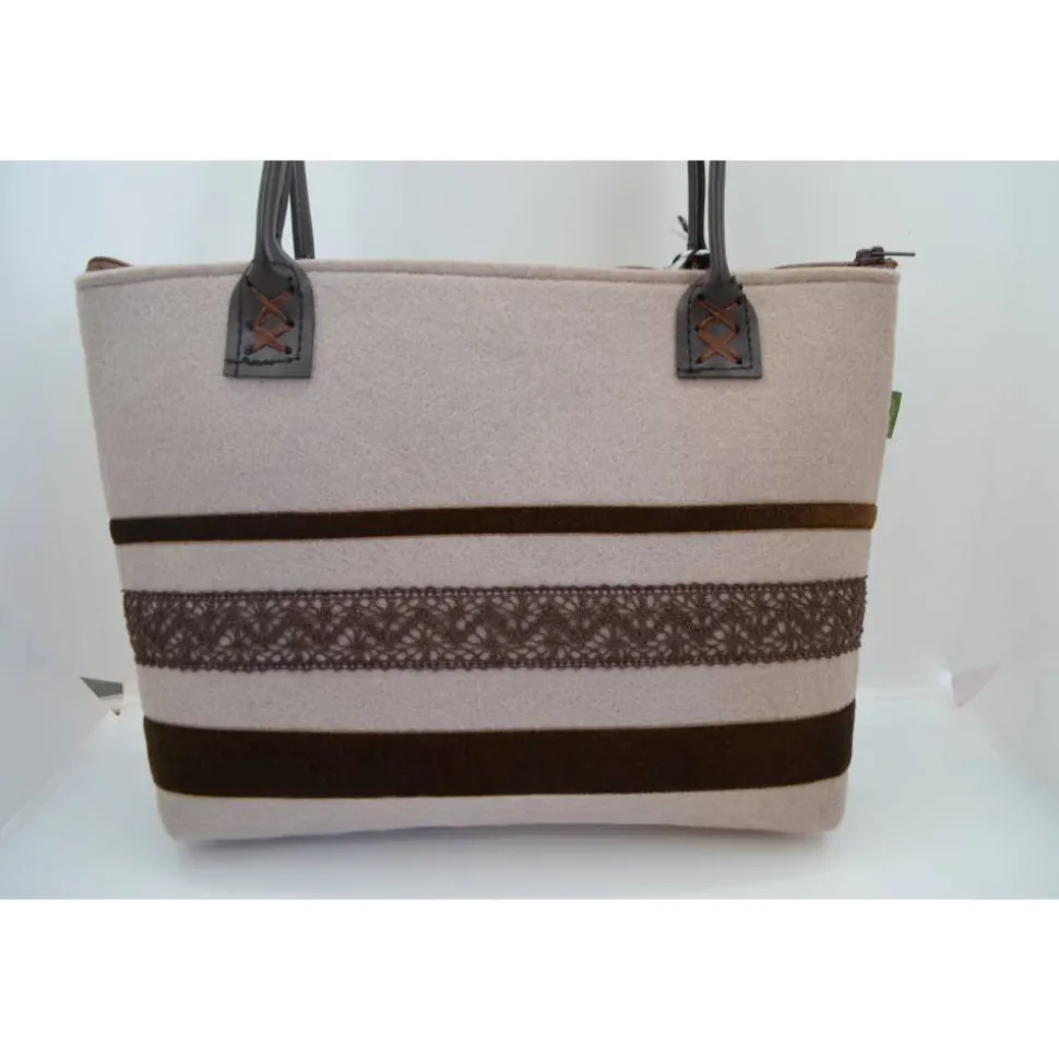 Diese schlichte Tasche aus taupe-farbenem Filz mit dunkelbraunen Samtbändern und Spitze passt perfekt zum Dirndl oder auch zur Lederhose!