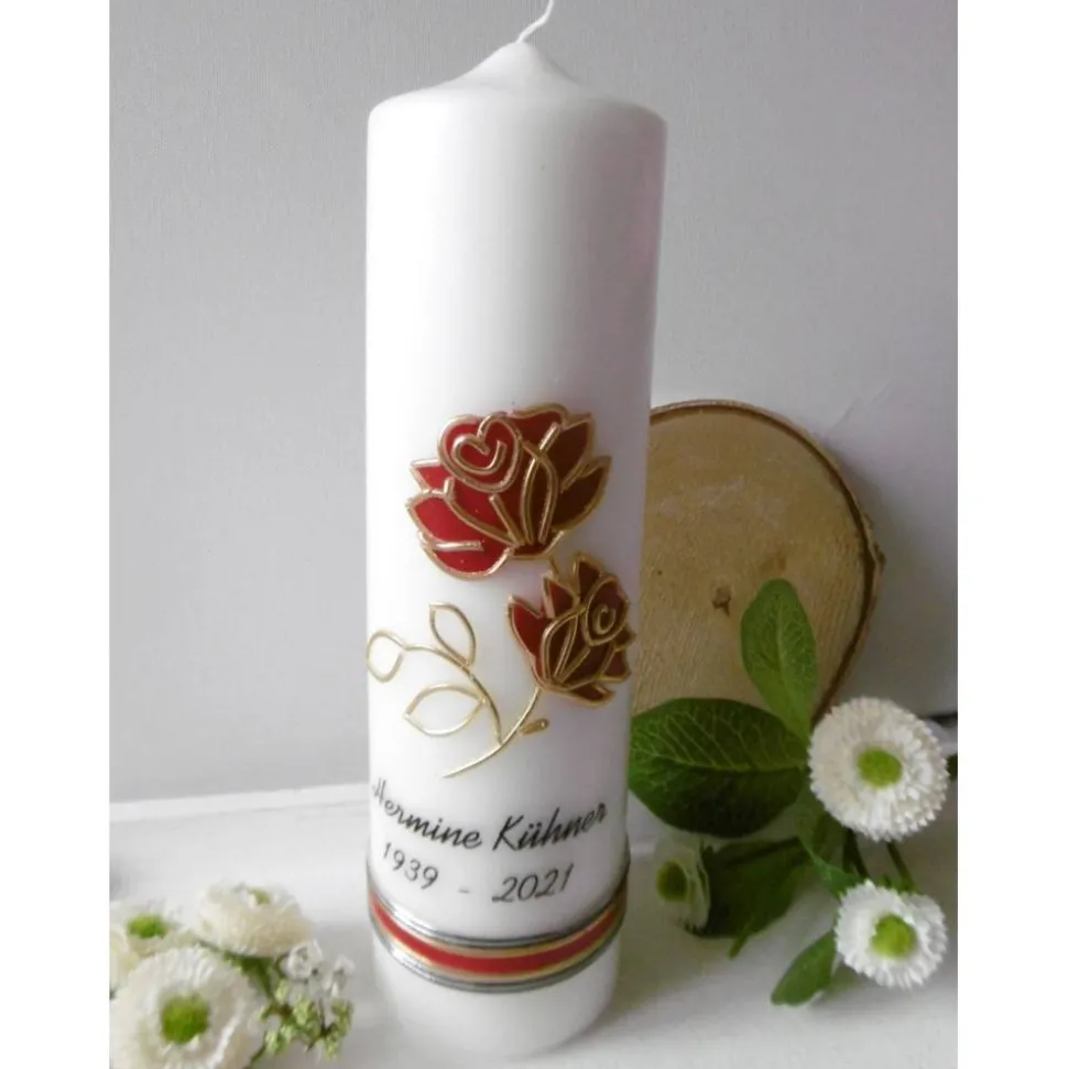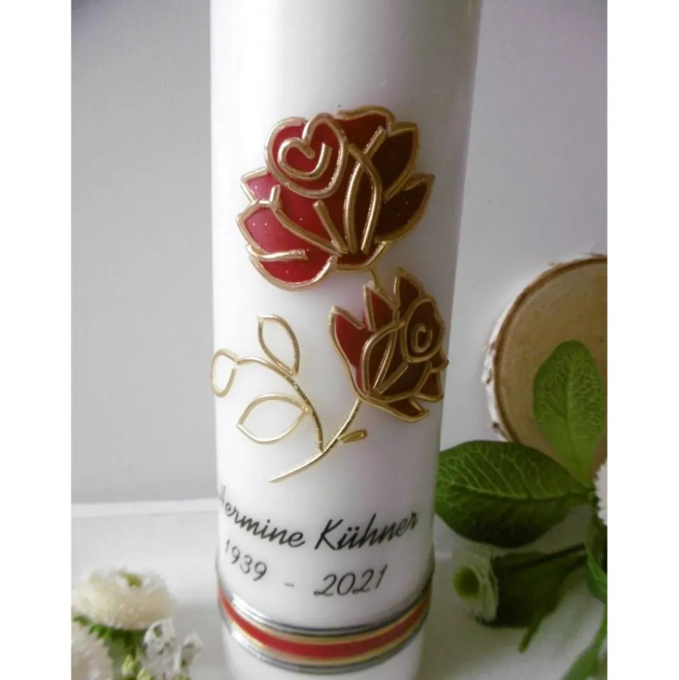 Wir haben einen Kerzenstumpen mit einem Rosenzweig mit 2 Blüten in Vollwachsauflage gestaltet. Die Rosenblüten sind in dunkel rot und gold gehalten. Unter der Beschriftung mit dem Namen der/des Verstorbenen und den Lebensdaten ist im unteren Teil der Kerze eine Art Wachsband aus rot – gold – schwarzfarbigen Verzierwachsstreifen aufgebracht.