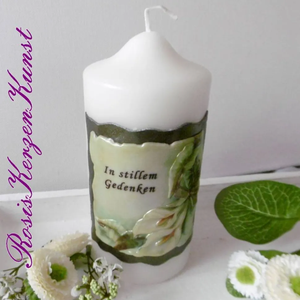 Wir haben einen Kerzenstumpen mit einem Wachsbild und dem Schriftzug “ In stillem Gedenken “ in Vollwachsauflage gestaltet. Die Individualisierung ( Beschriftung ) wird ohne Extrakosten von uns nach Ihren Angaben aufgebracht.
