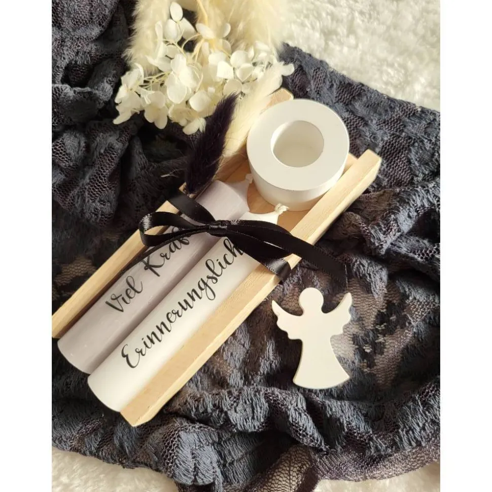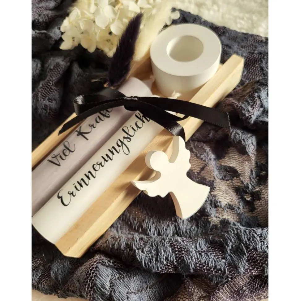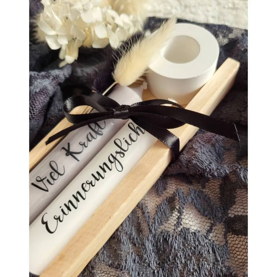 Alle Komponenten werden von Hand gefertigt, sodass du ein einzigartiges und stilvolles Trauergeschenk erhältst. Die Kerzen sind mit einer speziellen Wasserschiebefolie veredelt, die beim Abbrennen bedenkenlos mit Abgebrannt werden kann.