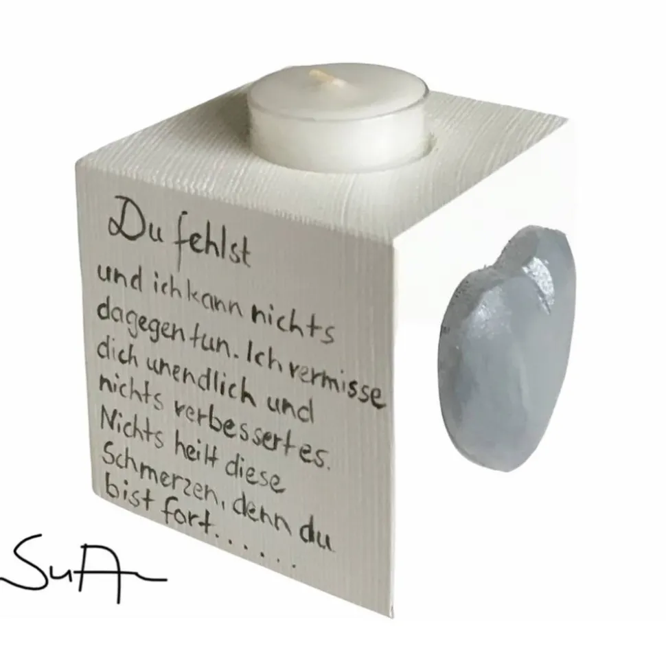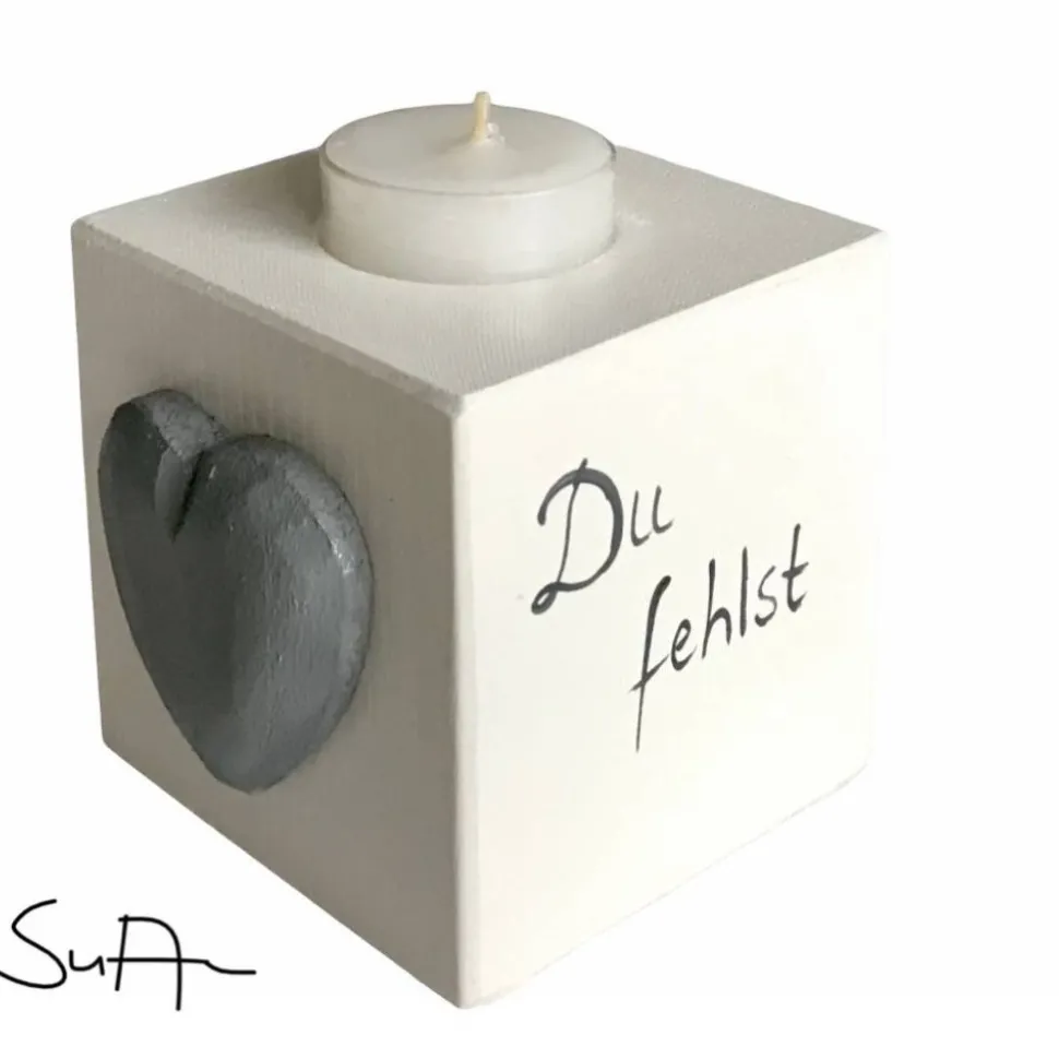 Jeder Kerzenwürfel wird nach dem Kauf individuell für Sie bemalt. Die Teelichthalter können mit Namen,Daten, christlichem oder persönlichem Vers personalisiert werden. Farbwünsche werden gerne berücksichtigt.