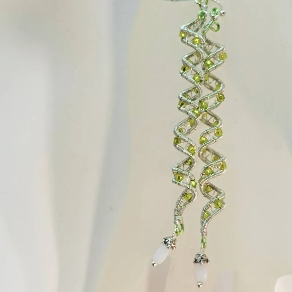 Der Ohrschmuck mit den wertig schillerndem kleinen engewebten Glasperlchen ist angenehm zu tragen an der versilberten Hakenbrisur..