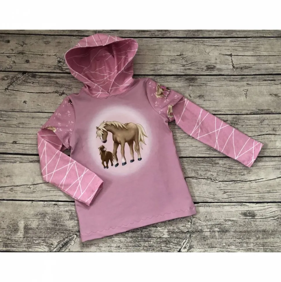 Das Shirt ist im Lagenlook genäht mit Kapuze aus einem wunderschönem Motiv-Panel mit passenden Kombistoffen.