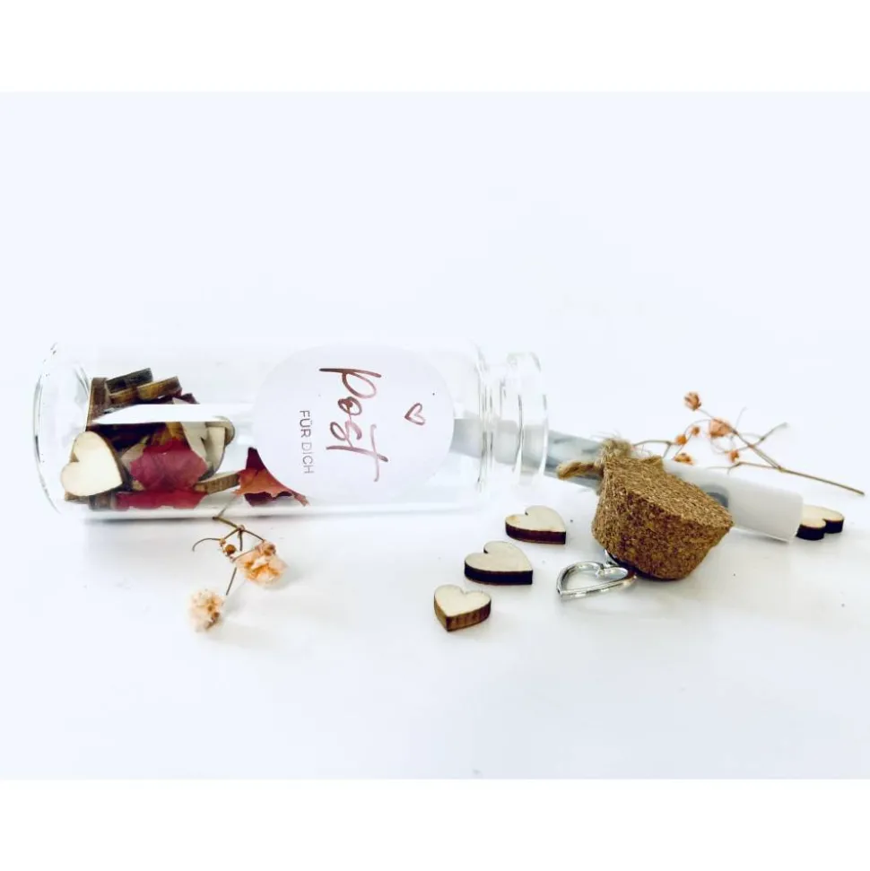 Sie ist aus Glas und hat einen Korkverschluss in dem ein kleiner Herzanhänger steckt.