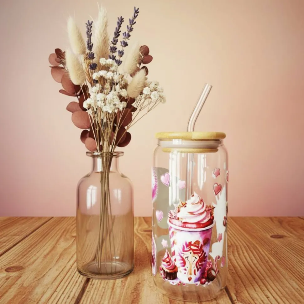 Das Glas hat ein Fassungsvermögen von 470ml und es wird mit einem Glasstrohhalm, Bambusdeckel und einer Bürste zum reinigen des Strohhalm geliefert.