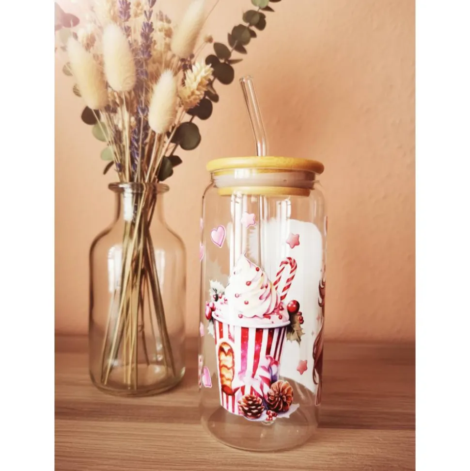 Das Glas ist mit einer DTF Folie beklebt, weswegen das Glas nicht Spülmaschinen und Mikrowellen geeignet ist.