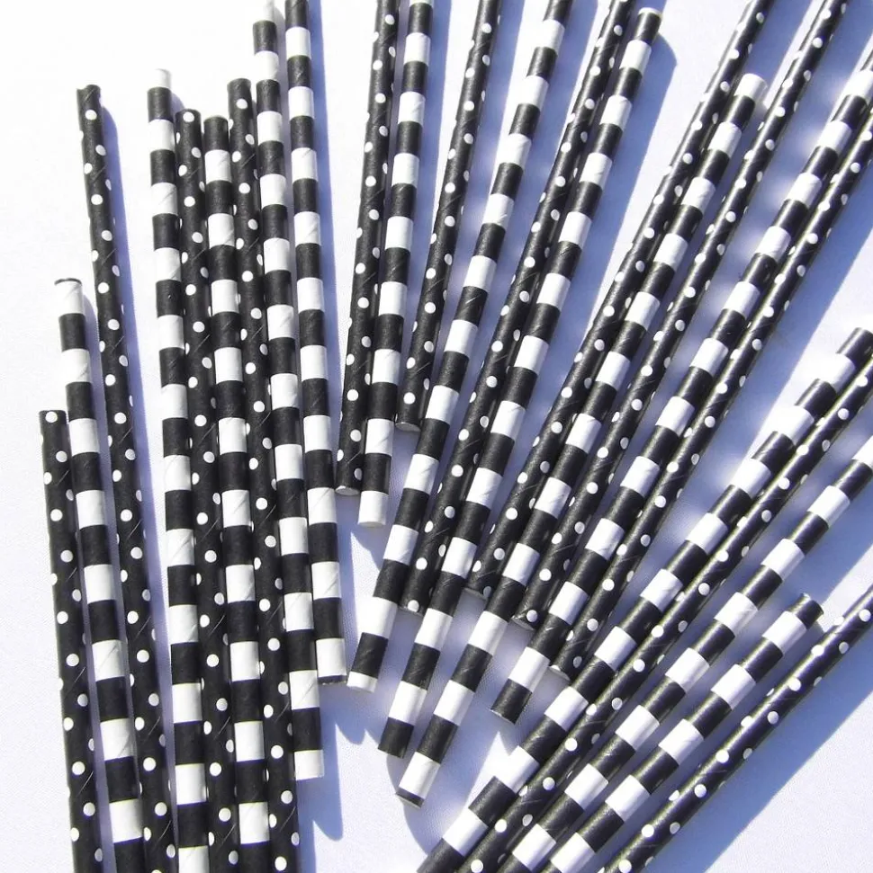 Die Trinkhalme sind gestreift und gepunktet in einem Set. Solche Trinkhalme sind eine wunderschöne Partydeko. Sie können einfach so in einem Glas auf den Tisch gestellt werden.
