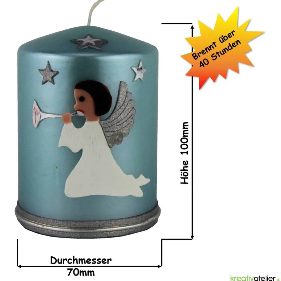 Meine Weihnachtskerzen werden aufwändig von Hand mit Wachs verziert. Zunächst wurde die Oberfläche dieser Kerze mit einer Kerzenfolie in türkis überzogen. Dadurch bekommt sie den Metalleffekt. Der detailreich gestaltete Engel spielt auf seiner silbern glänzenden Trompete. Sein weißes Gewand fällt in feinen Falten herunter. Die zarten Flügel schimmern in mattem silber. Das Gesicht mit den kurzen dunkelbraunen Haaren sind liebevoll aus Wachs gestaltet.
