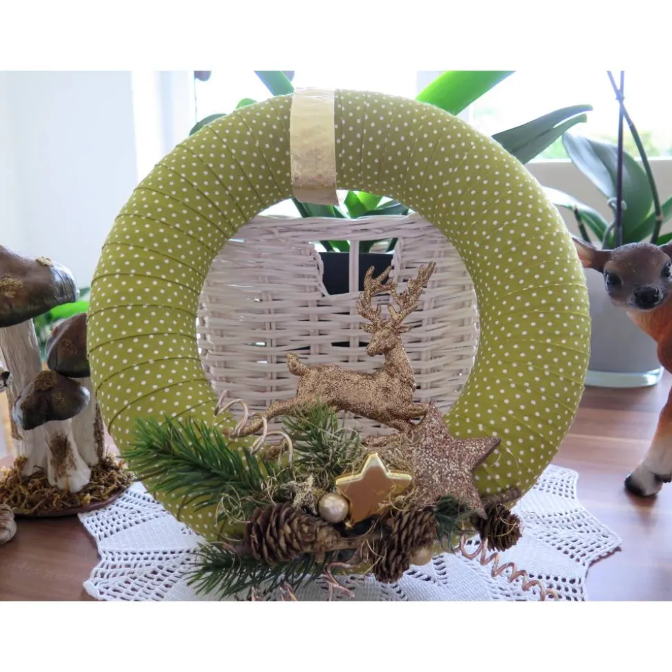 … mit grün-weiß gepunktetem Stoff umwickelter Styropor-Halbkranz (Durchmesser 30 cm)