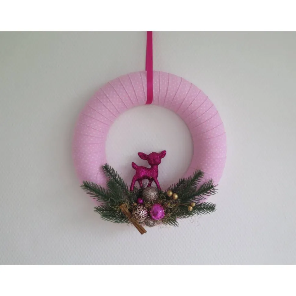 … mit pinkfarbenem Rehkitz, Kugeln, Tannenzweigen, Zimtstange usw. verziert