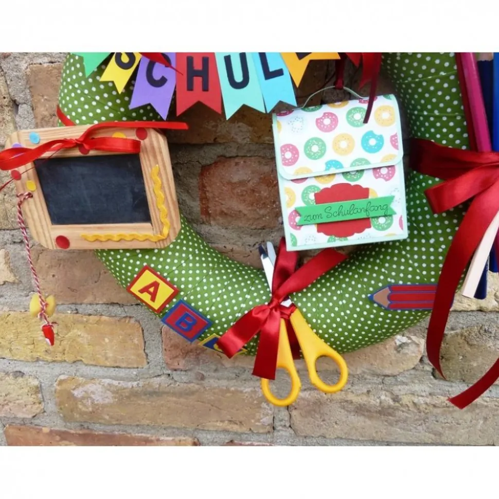 Ein kleiner Ranzen den ich aus Tonkarton gearbeitet habe lässt sich öffnen und bietet für weitere Kleinigkeiten oder einen Geldschein Platz, er hat 2 Magnete und lässt sich dadurch problemlos öffnen und schließen. Die Sachen sind mit Satinbändern befestigt oder aufgeklebt, aufgehängt wird der Kranz an einem Satinband.