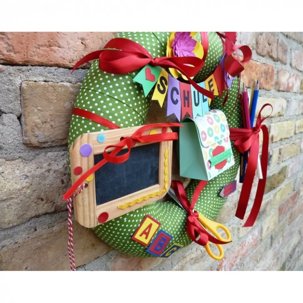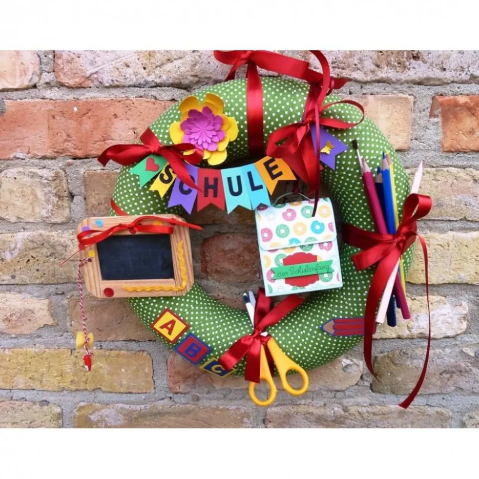 Wunderschöner aufwendig gearbeiteter Türkranz zum ersten Schultag/zur Einschulung. Den Kranz hab ich aus einem Styroporring (mit flacher Rückseite) gearbeitet den ich mit meterlangen 5 cm breiten Baumwollstoffstreifen umwickelt habe.