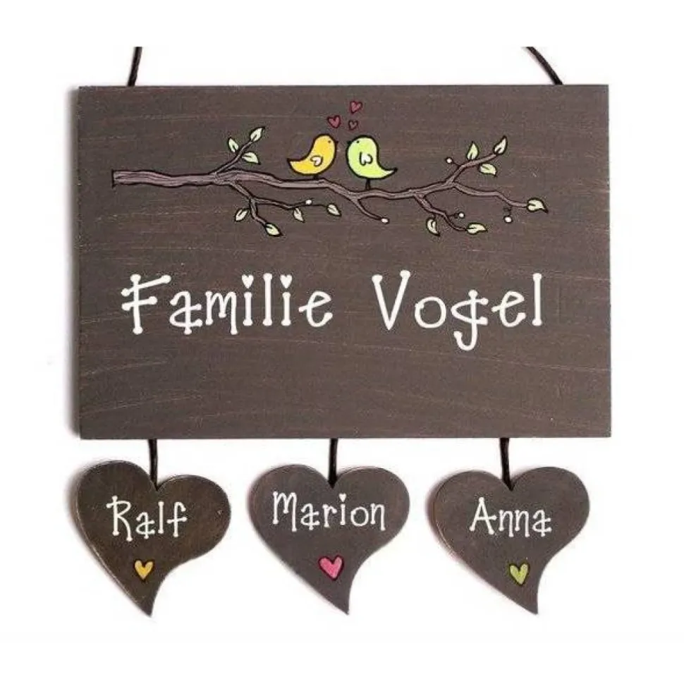 Gestalte deinen Eingangsbereich einzigartig! Das exklusive Türschild aus Naturholz wird individuell für dich angefertigt und mit deinem Familiennamen sowie den Vornamen auf bis zu 4 Herzanhängern personalisiert. Das handgefertigte Holzschild ist wetterfest, langlebig und mit viel Liebe zum Detail bemalt.