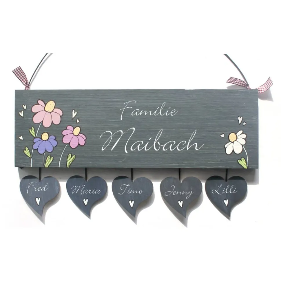 Bis zu sechs handbemalte Herzanhänger finden nebeneinander Platz und werden mit den Vornamen Deiner Familie oder des Brautpaares beschriftet. Jedes Herz wird mit kleinen, liebevollen Details verziert. Die Schriftart kannst Du frei aus der Auswahltabelle bei den Produktfotos wählen.