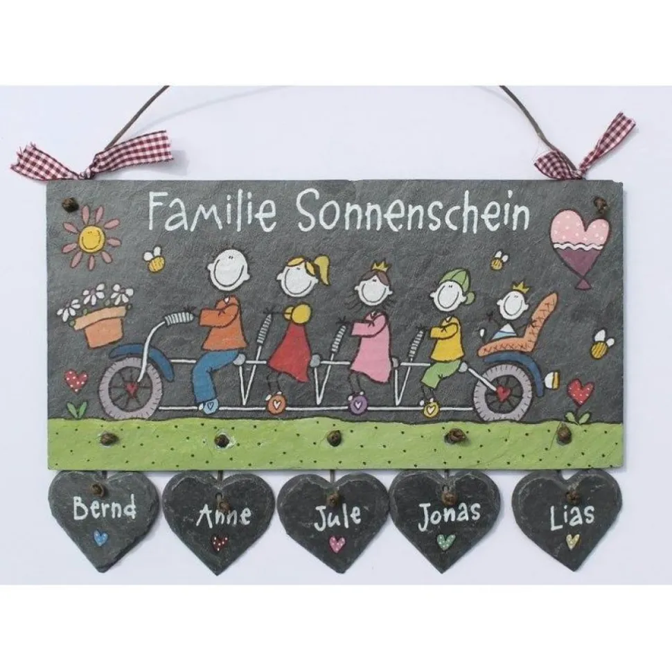 Verleihe deinem Hauseingang einen einzigartigen Charme! Dieses exklusive Türschild aus Schiefer wird individuell für dich angefertigt und besticht durch seine edle, zeitlose Optik. Dein Familienname wird oben auf dem Schild in der gewünschten Schriftart platziert, während liebevoll bemalte Figuren deine Familie auf einem Fahrrad darstellen. Die Figuren kannst du ganz nach deinen Wünschen auswählen und kombinieren – ob Haarfarbe oder Outfit, alles ist möglich!