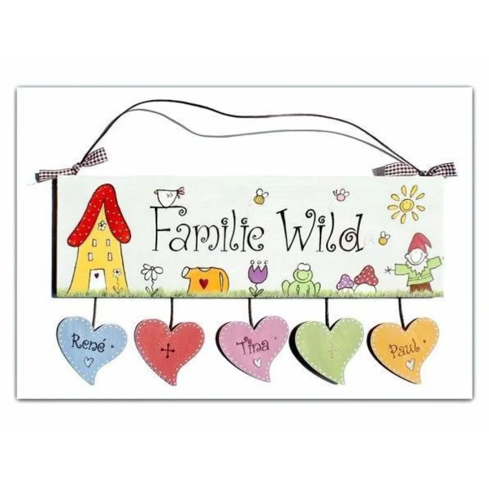 Das hochwertige Türschild besticht durch sein exklusives Design: Es wird mit einer grünen Wiese, Haus, Blumen, Gießkanne, Frosch, Pilzen, Zwerg, Sonne und Bienen von Hand bemalt und mit deinem Familiennamen in Wunschschriftart versehen. Bis zu 6 Herzanhänger werden in deinen Wunschfarben gestaltet und mit den Vornamen deiner Liebsten beschriftet.