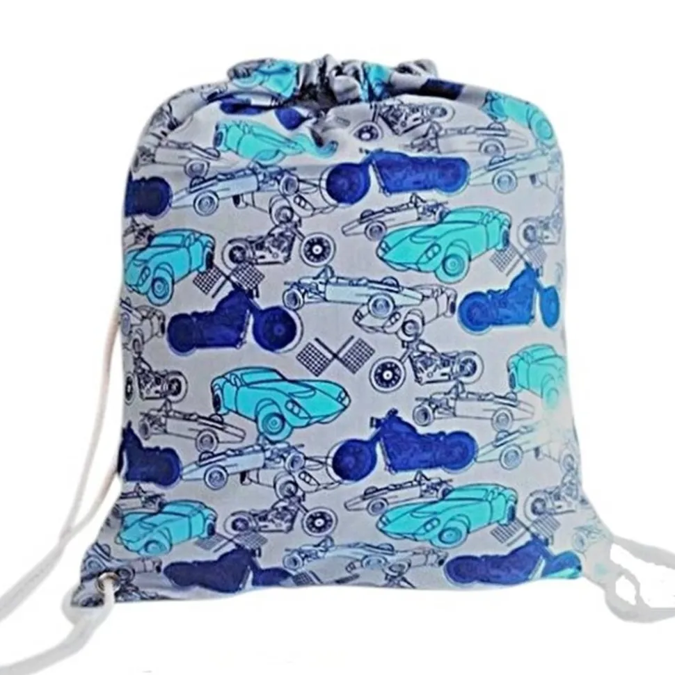 Turnbeutel, Rucksack blau mit Auto-Motiv, personalisierbar
