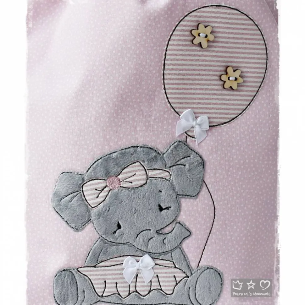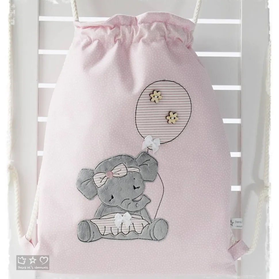 *Liebevoll genähter Rucksack-/Beutel in verschiedenen Größen aus hochwertigen Stoffen, unterlegt mit Volumenvlies für mehr Stabilität. Auf der Vorderseite befindet sich eine Doodlestickerei ‚Elefant mit Luftballon‘ und auf Wunsch kann ein Name aufgestickt werden. Die Innenseite des Rucksacks-/Beutels ist mit einem farblich passenden Baumwollstoff gefüttert. Ebenso befindet sich eine kleine Tasche (z.B. für Taschentuch usw) im Inneren.
